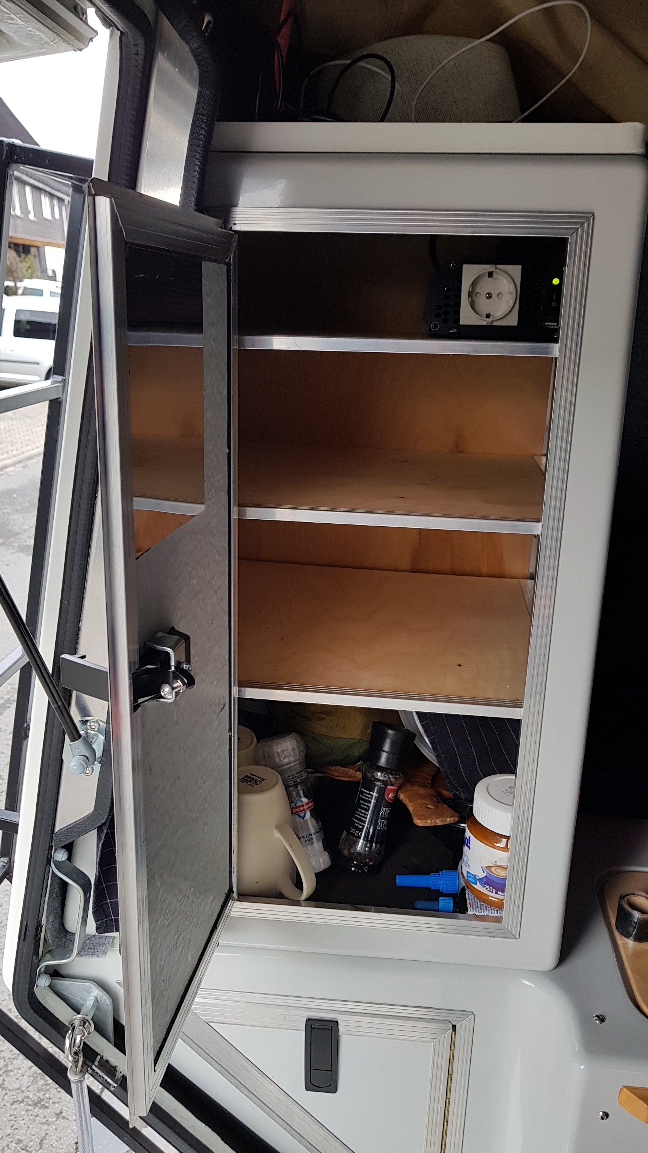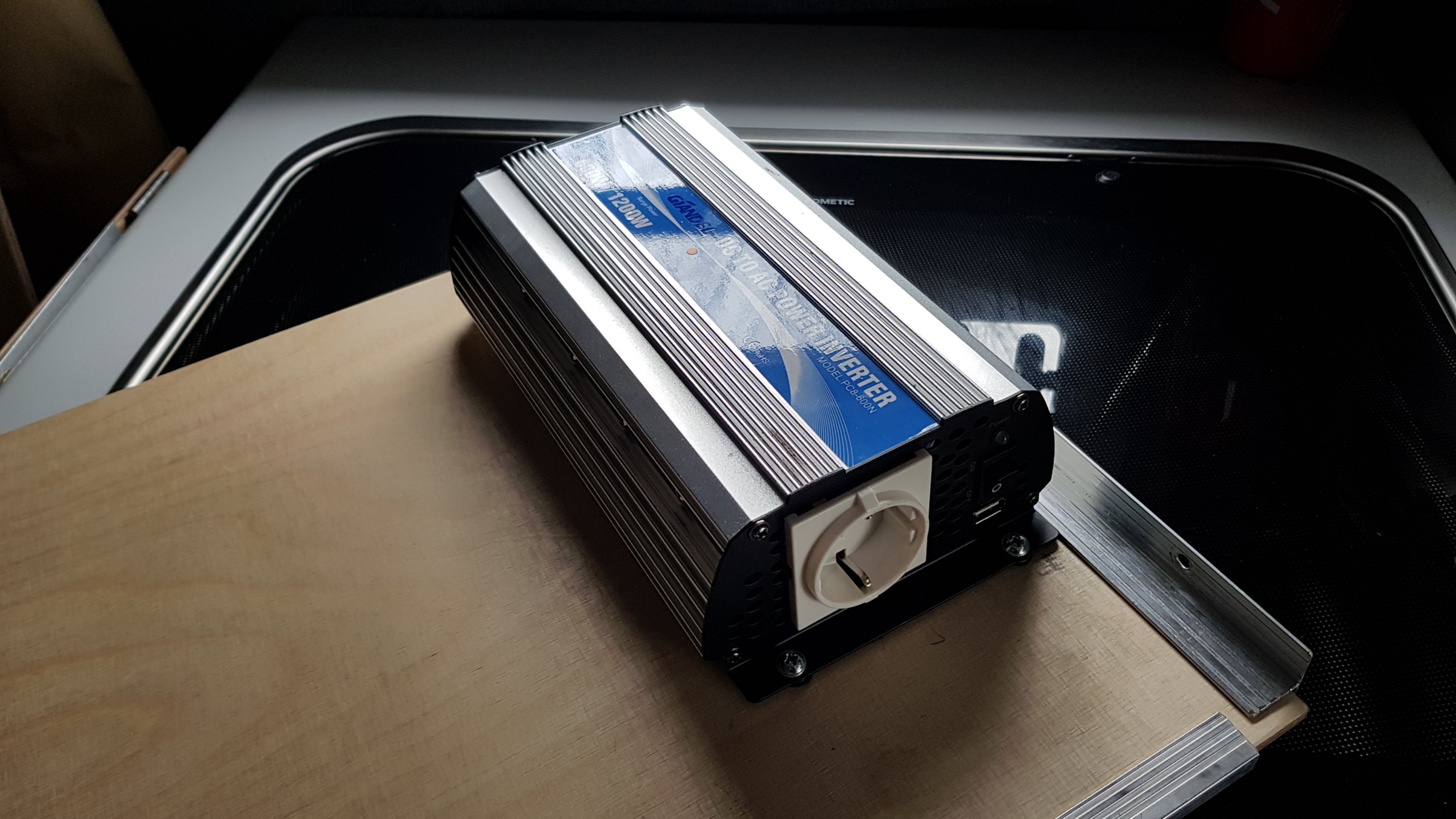 Bei den letzten Touren habe ich hin und wieder eine Möglichkeit vermisst 230 Volt an Bord zu haben. Die Kabine verfügt zwar über eine 230 Volt Steckdose, diese funktioniert allerdings nur, wenn man an einem Stellplatz Strom von einer externen Quelle von außen über einen speziellen CE Stecker zuführt. Dann würde auch der Kompressorkühlschrank sofort umswitchen und über 230 Volt laufen. Habe ich in den letzten Jahren aber noch nie benötigt. Mir geht es darum die Akkus der Fotoapparate, das Laptop, den Akku vom E Bike, Rasierapparat usw. zu laden. Alle Teile, wo eine Lademöglichkeit per USB nicht möglich ist. Ein Spannungswandler kann also die 12 Volt der Solaranlagen gespeisten Batterie in 230 Volt umwandeln. Die Geräte gibt es in Versionen von 300 Watt – 2000 Watt. Für die meisten Gerätschaften sind 300 Watt völlig ausreichend. Manche betreiben mit entsprechend dimensionierten Wandler eine Kaffee(pad)maschine. Manche träumen davon, einen Haarföhn damit zu betreiben. Wenn es sich um eine Kurzhaarfrisur handelt, mag ein Föhn mit niedriger Wattleistung kurzfristig funktionieren. Man sollte sich aber vom Gedanken trennen, einen 2300 Watt Föhn eine Stunde lang, wie beim Frisör, für eine Langhaarfrisur nutzen zu können. Das wird nur theoretisch funktionieren. Dann muss man in anderen Qualitäten, Stärken und Preislagen denken. Das Haar föhnen hat sich bei mir aber sowieso erledigt.:-)