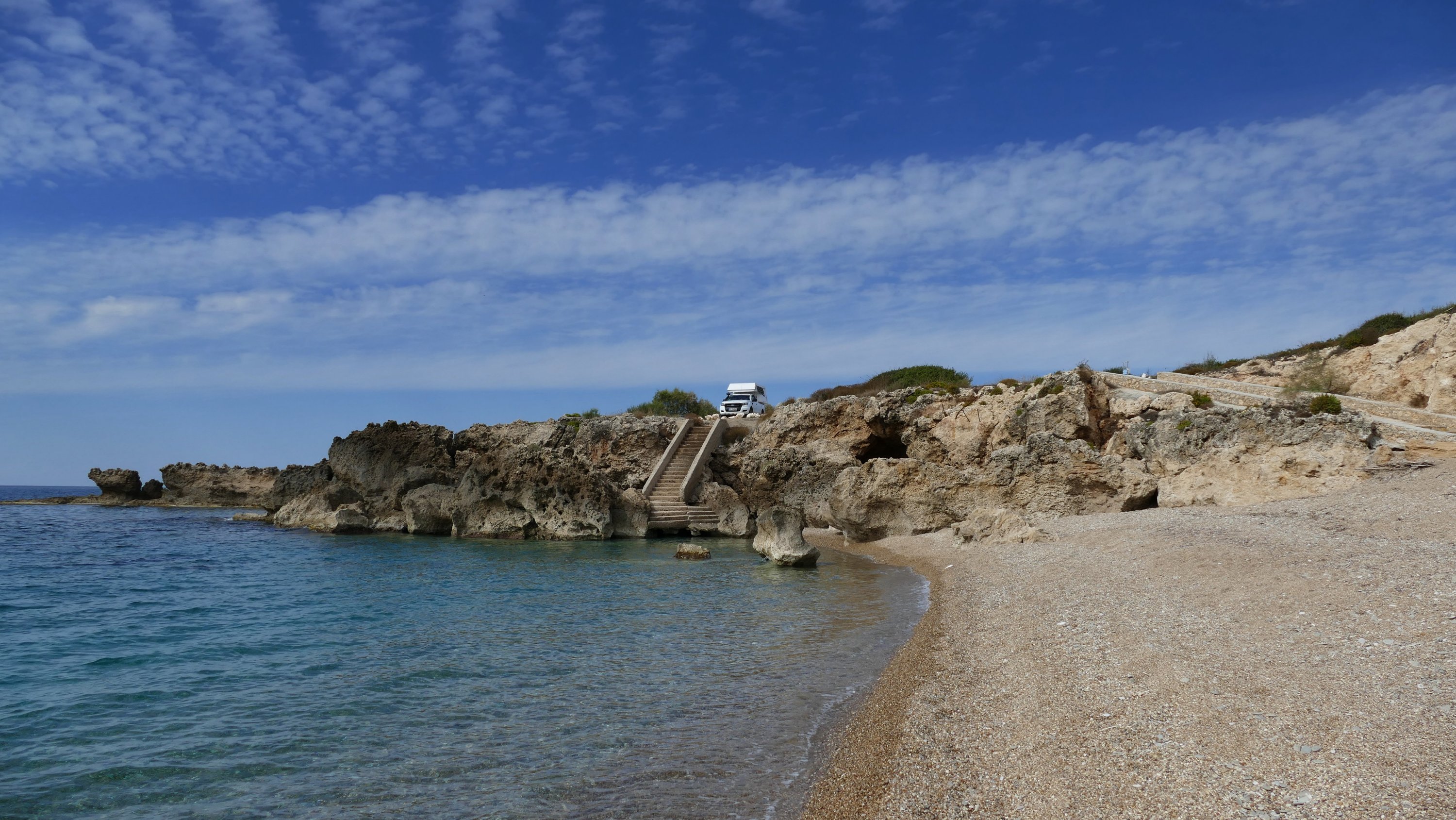 Auf dem Weg nach Patras finden wir noch den schönen Strand Stomio Beach. Den Strand haben wir komplett für uns alleine. Oberhalb befindet sich ein Stellplatz.