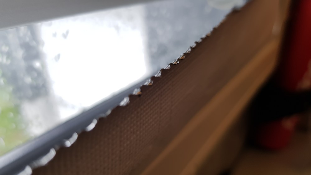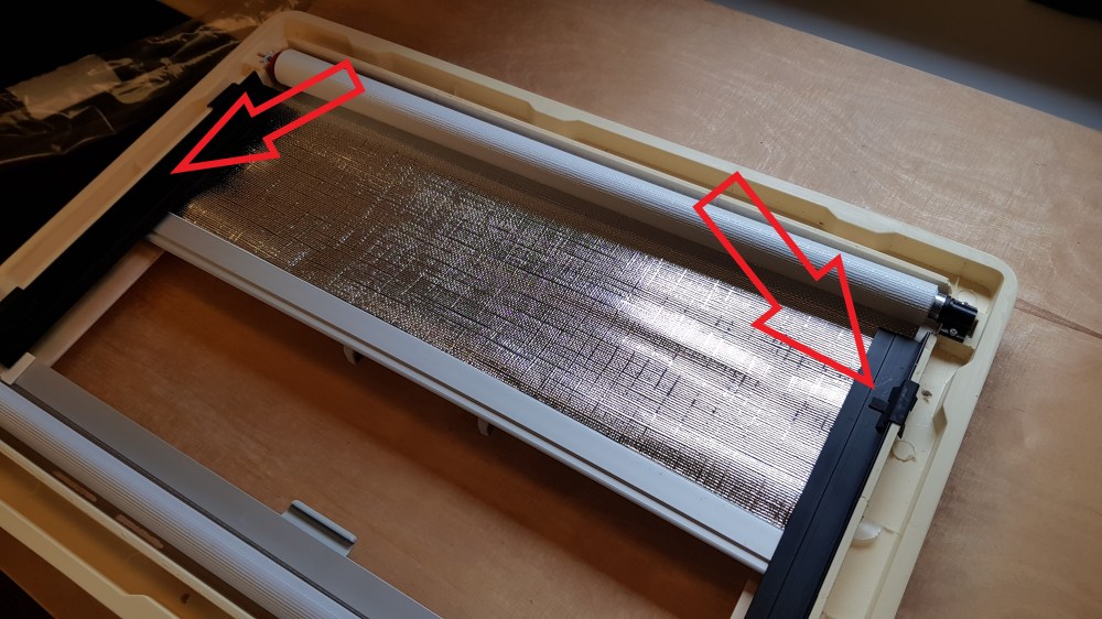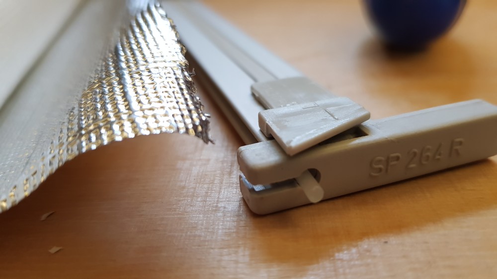 Durch das gewaltsame Durchgreifen durch den erfolglosen Dieb, war nun die Verdunklungsfolie, die mit einem Keder in der Alu-Schiene eingelassen ist, abgerissen. Reparatur durch kleben etc. war nicht möglich.