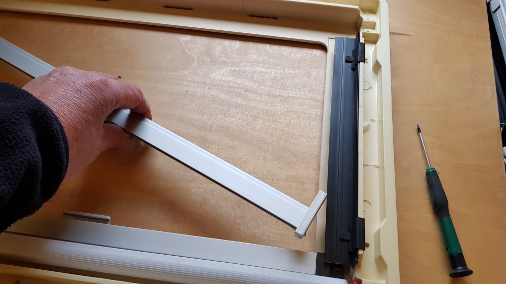 Also musste ein neues, unteres Rollo herbei. Die Ersatzteilbesorgung erwies sich als mühselig, da es unzählige Variationen und Baujahre gab . Wie ich dann merkte bekommt man die Teile nicht als Endabnehmer direkt beim Hersteller, sondern muss über den Caravan-Einzelhandel bestellen. Letztlich konnte mir Steffi, vom Hersteller der Fernweh-Kabine die richtige Artikelnummer organisieren (Art. VR 33) und ich bestellte dann bei der Fa. Reimo. Was mich dabei geärgert hat, war neben den mehrmonatigen Lieferzeiten, dass zu den Frachtkosten noch eine „Mindermengenbestellpauschale“ von 7,50 € drauf geschlagen wurde.