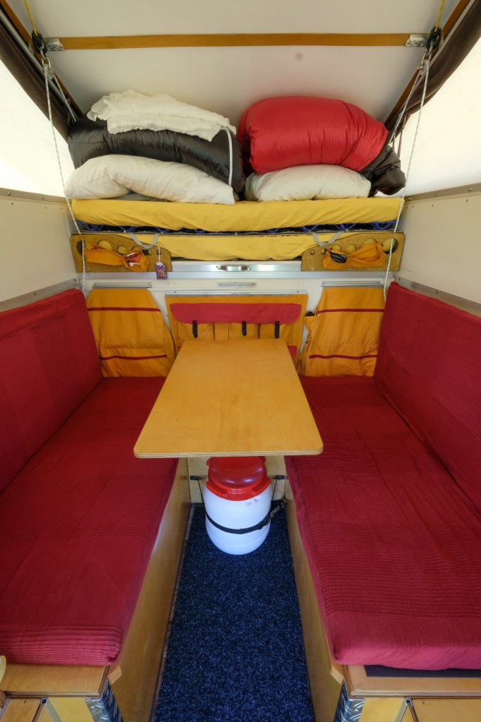 D+O: Es ist eine Ortec Minicamp Kabine, die von den Vorbesitzern unseres Fahrzeugs selbst ausgebaut wurde. Es handelt sich um einen geschweißten Alurahmen auf den Aluriffelblechplatten geklebt und genietet werden. Die Kabine hat keinen Boden und wird direkt auf den Bordwänden der Ladefläche befestigt. Sie wird vom Hersteller nur leer angeboten, so dass sie dann individuell von den Käufern ausgebaut wird. Wir haben vorne am Alkoven noch ein Transportrohr ergänzt, um einen von außen schnell zugänglichen Stauraum zu haben. Unser Innenausbau ist sehr robust und sauber aus Birke Multiplex gefertigt. Was natürlich den Vorteil einer großen Stabilität bringt. Auch nach teils schlimmen Pisten rattert, klappert und wackelt nichts. Allerdings ist das Gewicht dadurch recht hoch, womit wir wieder beim Fahrwerk sind.