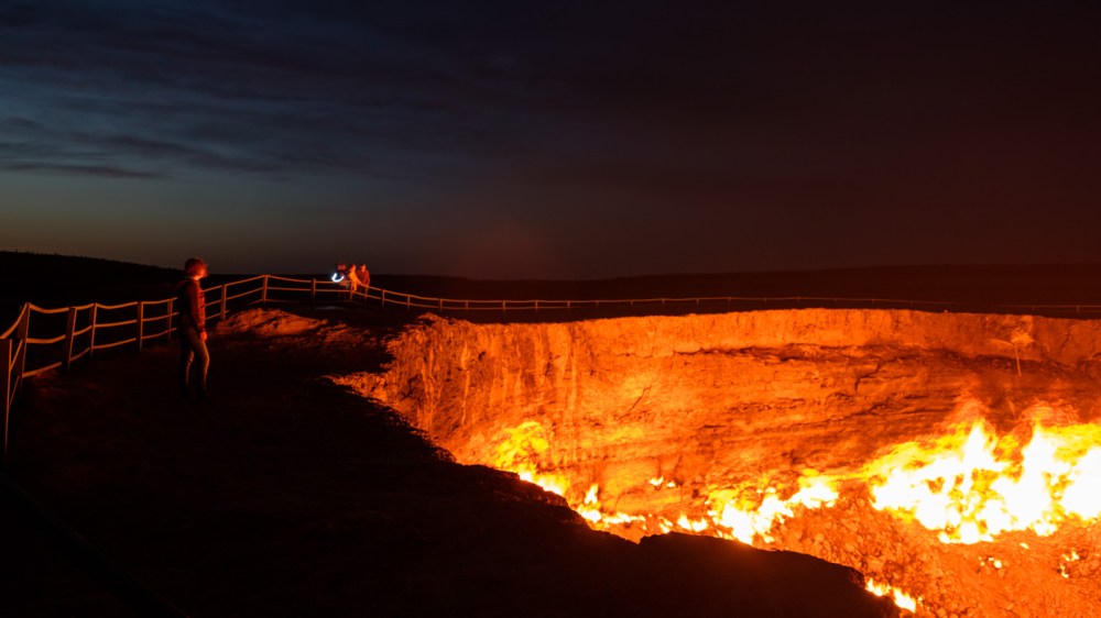 Es ist ein unglaublicher Ort, ein 20 Meter tiefes Loch im Boden mit einem Durchmesser von rund 70 Metern, aus dem an vielen Stellen Gas austritt. Angeblich stießen 1971 Geologen bei Probebohrungen auf dieses Gasvorkommen und zündeten es an, um die Geruchsbelästigung zu beseitigen. Sie sind wohl damals davon ausgegangen, dass nach wenigen Tagen das Feuer von selbst erlöschen würde. Nun ja, es brennt noch heute.