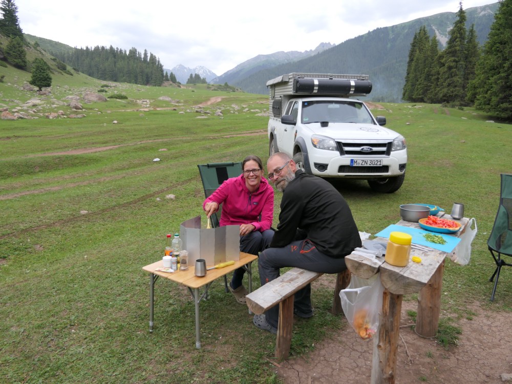 So haben wir auch das Ford Standardfahrwerk verbaut und hinten eine Goldschmitt Zusatzluftfeder ergänzt. Es zeigt sich aber leider gerade, dass wir besser gleich ein dem Reisegewicht angepasstes Fahrwerk hätten einbauen sollen. Auf den schlechten Straßen, die wir jetzt fast durchgängig erleben, ist die Belastung einfach zu groß. Neue, in Duschanbe eingebaute hintere Stoßdämpfer haben gerade mal 4000 km auf dem Pamir Highway und in Kirgistan überlebt, bevor wir sie wieder austauschen mussten. Und das, obwohl wir sehr langsam und vorsichtig fahren. Wir werden jetzt versuchen, weiterhin langsam und vorsichtig in die Mongolei und zurück nach Deutschland zu fahren und dort dann aber das Fahrwerk umrüsten. Vermutlich OME oder Ironman 4×4