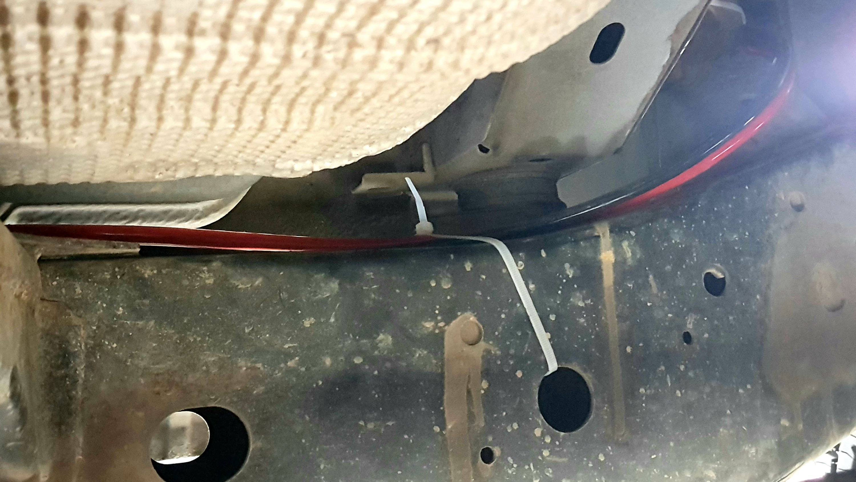 Die Kabel führt man dann vom Motorraum auf den rechten Leiterrahmen. Da dieser praktischerweise durchlöchert ist, lässt sich das Kabel mit Kabelbinder prima auf dem Rahmen fixieren. Dann geht es vor den Hinterreifen hoch zur Pritsche.