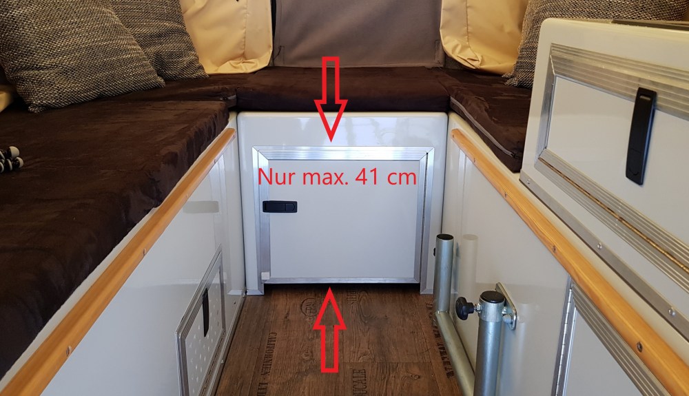 Seit Jahren halte ich nach solch einer TT- Toilette ausschau. Bis jetzt gab es leider keine kleine geeignete Version einer TTT auf dem Markt, die in den beengten Platz hinein passt, wo bis jetzt mein Porta Potti steht. Die Höhe von 41 cm ist das Problem.(Das Maß kann aber bei allen Fernwehkabinen etwas anders sein. Bitte prüfen!) Ein Umbau der Türe ist für mich zu aufwändig, da darüber auch ein kleines Staufach liegt. Bestellt man eine Fernwehkabine neu, kann man das Maß direkt ab Werk passend bestellen und die Toilette sollte dann komplett hineinpassen. Die Tiefe und die Breite sind kein Problem. Nur an der Höhe hängt es.