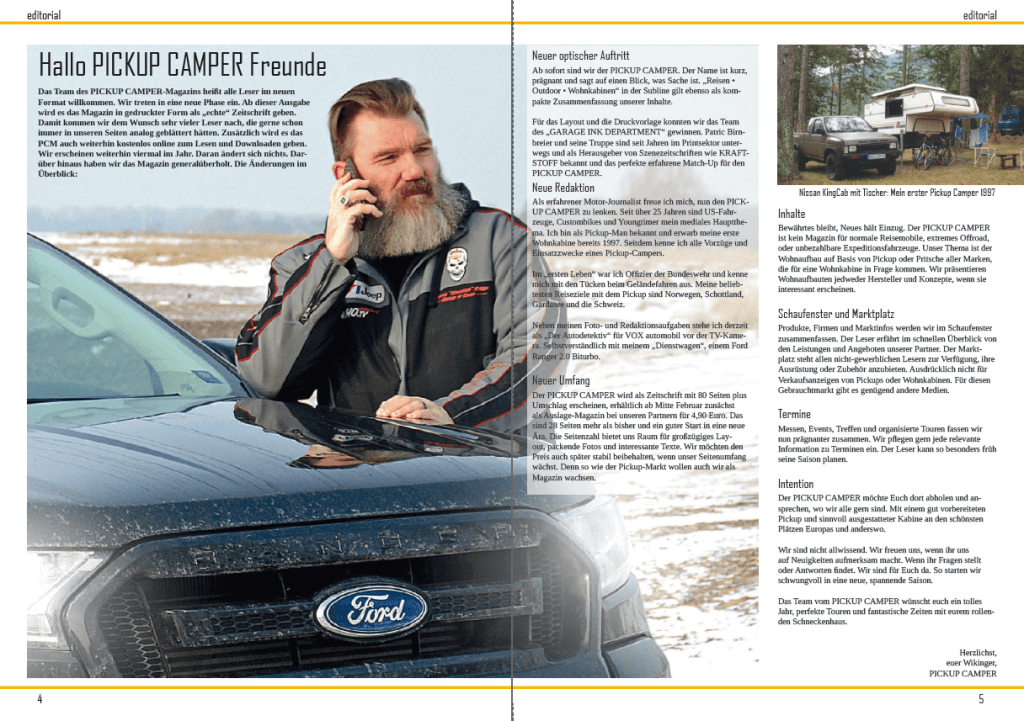 Das PICKUP CAMPER Magazin wird mit mehr als 100 Seiten dicker, bekommt neue feste Rubriken, wie „Schaufenster“ und „Marktplatz“, sowie ein komplett überarbeitetes Layout und Erscheinungsbild.