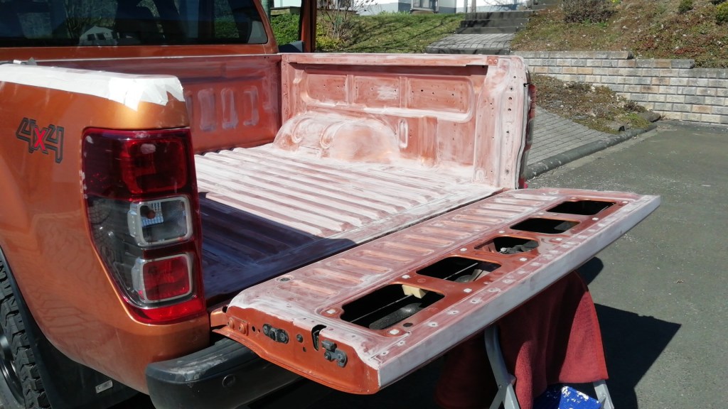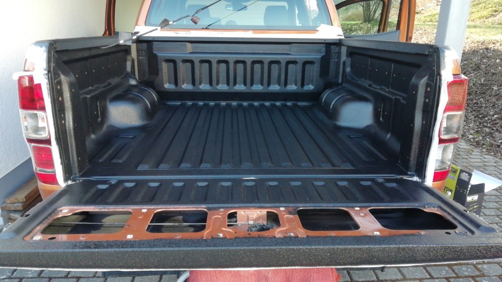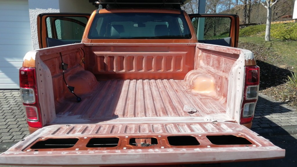 Viele Pickups sind mit einer Kunststoff Laderaum Wanne ausgestattet, um die originale Pritsche vor Beschädigung zu schützen. Und so glaubt man als stolzer Pickup Besitzer, seinem Fahrzeug etwas besonders Gutes mit dieser Schutzwanne zu tun. Aber genau das Gegenteil ist – meiner Meinung nach – der Fall. Sicherlich kommt es natürlich auch auf die Art der Belastung an. So schützt sie sicher erst einmal gegen manche Art der Beanspruchung. Wenn ein Handwerker seine Maschinen oder Material auf der Fläche transportiert, ist so etwas nicht schlecht. Aber gerade für uns Wohnkabinenfahrer ist so eine zusätzliche Laderaumwanne nicht besonders sinnvoll. Über die Jahre sammeln sich Staub, Dreck, kleine Steine, Sand uns sonstiger Unrat unter der künstlichen Oberfläche. Gepaart mit Feuchtigkeit, die nicht abtrocknen kann, ergibt dieser Schmodder ein prima Schmirgelpapier. Er scheuert im Laufe der Zeit den Lack der Pritsche auf und der Gammel ist vorprogrammiert. Aus diesem Grund ist meine Wanne direkt nach dem Kauf des Pickups in den Müll gewandert. Der Plan war „irgendwann einmal“ eine Ladeflächenbeschichtung aufzutragen. Das war vor 4 Jahren:-) Aber nun ist es so weit! Bevor nun die neue Saison startet und die Fernwehkabine aufgesetzt wird, schütze ich die Ladefläche mit einer Ladewannenbeschichtung.