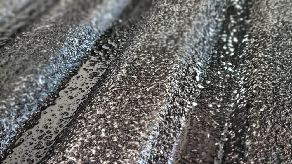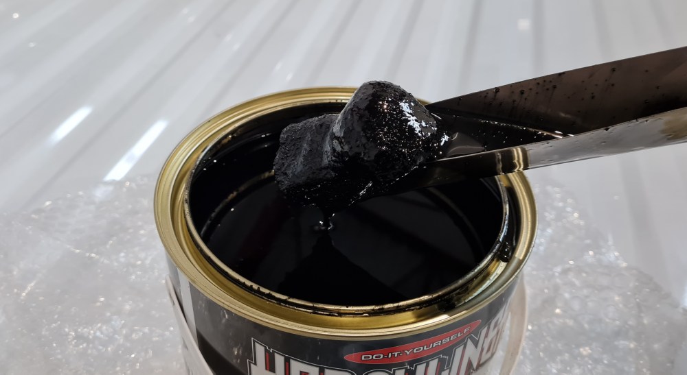 Nun muss kräftig gerührt werden. Im unteren Bereich haben sich die festen Gummiteile versammelt und oben befindet sich nur dünnflüssiges. Auch zwischendurch muss man immer mal wieder zum Rührstab greifen. Die Gummihandschuhe liegen übrigens nicht aus Spaß dabei. Solange es noch frisch ist, lässt es sich gut von den Händen abwaschen. Ist es einmal getrocknet, wird es doof. Wenn die schwarze Flüssigkeit auf den Händen oder der Haut längere Zeit unentdeckt festgebacken ist, dann soll man die Partie für 10-15 Minuten in warmem Seifenwasser einweichen, sanft schrubben und dann großzügig Feuchtigkeitscreme auftragen. Herculiner geht für gewöhnlich innerhalb von 2-3 Tagen ab. Das kann ich bestätigen :-). Mit dem beiliegenden Pinsel fängt man in den Ecken an. Dort wo die Rolle schlecht hinkommt.