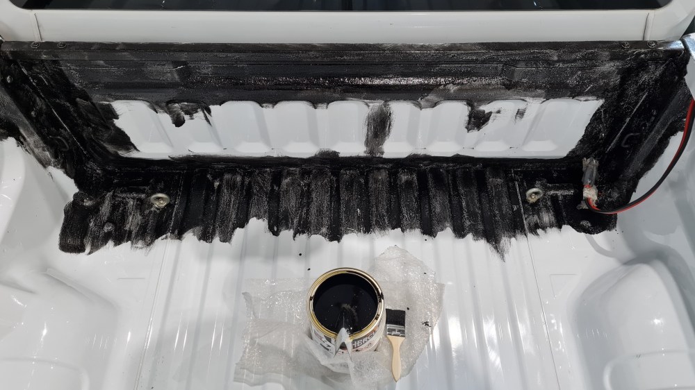 Jetzt wird gerollt bis die Ladefläche vollständig beschichtet ist. In einem Forum habe ich gelesen das sich die Rollen auflösen. Das stimmt! Anscheinend zersetzt das Lösungsmittel in der Farbe den Kunststoff der Rolle. Arbeitet man zu trödelig, zersetzt sie sich nach einer gewissen Zeit. Ist man mit der ersten Schicht fertig kann man die Rolle getrost wegschmeißen. Man muss aufpassen, dass die gelösten Teile der Rolle nicht auf der frisch lackierten Fläche verbleibt und mit eintrocknet. Dann heißt es 4 Stunden ! warten bis die Farbe nicht mehr klebrig ist. Erst dann die zweite Schicht auftragen. Aber auch nicht zu lange warten, damit die Schichten noch eine Verbindung eingehen können. Den Pinsel in eine Plastiktüte geben, damit er frisch bleibt für die nächste Schicht.