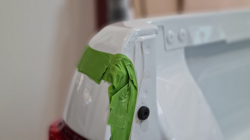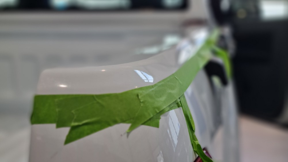 Wenn die zweite Schicht dann angetrocknet ist , habe ich das Frogtape entfernt. Wartet man zulange, härtet die Farbe mit dem Tape aus und die Farbe wird beim lösen brechen oder das Tape reißen. Da muss man den richtigen Zeitpunkt abpassen und nicht verschlafen. Deshalb kann es sinnvoll sein, bei der ersten Schicht nur nahe an den Rand des Klebeband zu streichen und erst bei dem zweiten Auftrag über den Rand auf das Tape zu gehen. So findet man dann besser den Punkt das Tape ab zu ziehen. Wenn jetzt doch mal etwas unterlaufen ist, lässt es sich noch im halbwegs feuchten Zustand prima reinigen. Wenn der Punkt des Aushärtens überschritten ist, wird es mühselig. Da hilft dann vielleicht eine Rasierklinge um die Farbe abzutragen. Ein Bekannter erzählte mir, dass er durch das Rollen nun kleine Spritzer auf seinem Lack hat. Die hat er auf seinem dunklen Fahrzeug nicht gesehen, aber jetzt spürt er sie, wenn er mit der Hand darüberstreicht. Bei meinem weißen Fahrzeug wäre es sicher optisch aufgefallen und man hätte reagieren können.