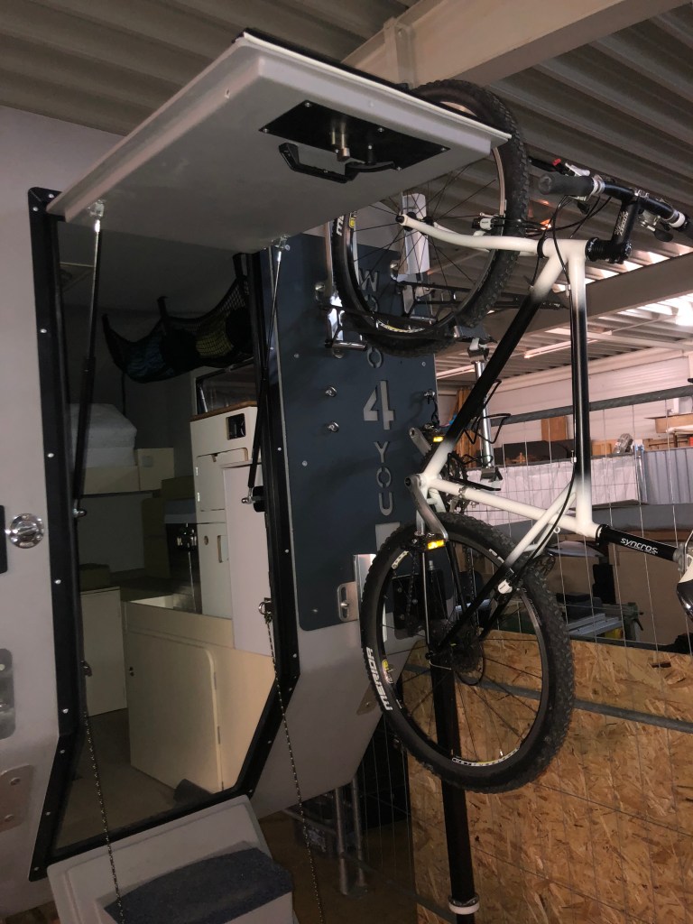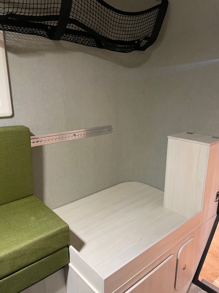 Steigt man durch die Hecktüre ins Innere, begibt man sich in ein Raumwunder. Die von außen optisch gewöhnungsbedürftige Hutze auf dem Dach, sorgt innen für eine angenehme Steh und Alkovenhöhe und Bewegungsfreiheit. Doch dann hat man den Eindruck, beim Innenausbau hat man auf der rechten Seite etwas vergessen. Dort ist nur ein Plateau in der besichtigten Ausführung. Aber das ist bewusst für die Individuelle Planung so belassen. Der Bereich ist zum Beispiel gedacht als: