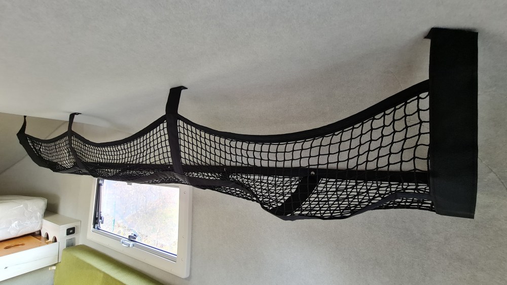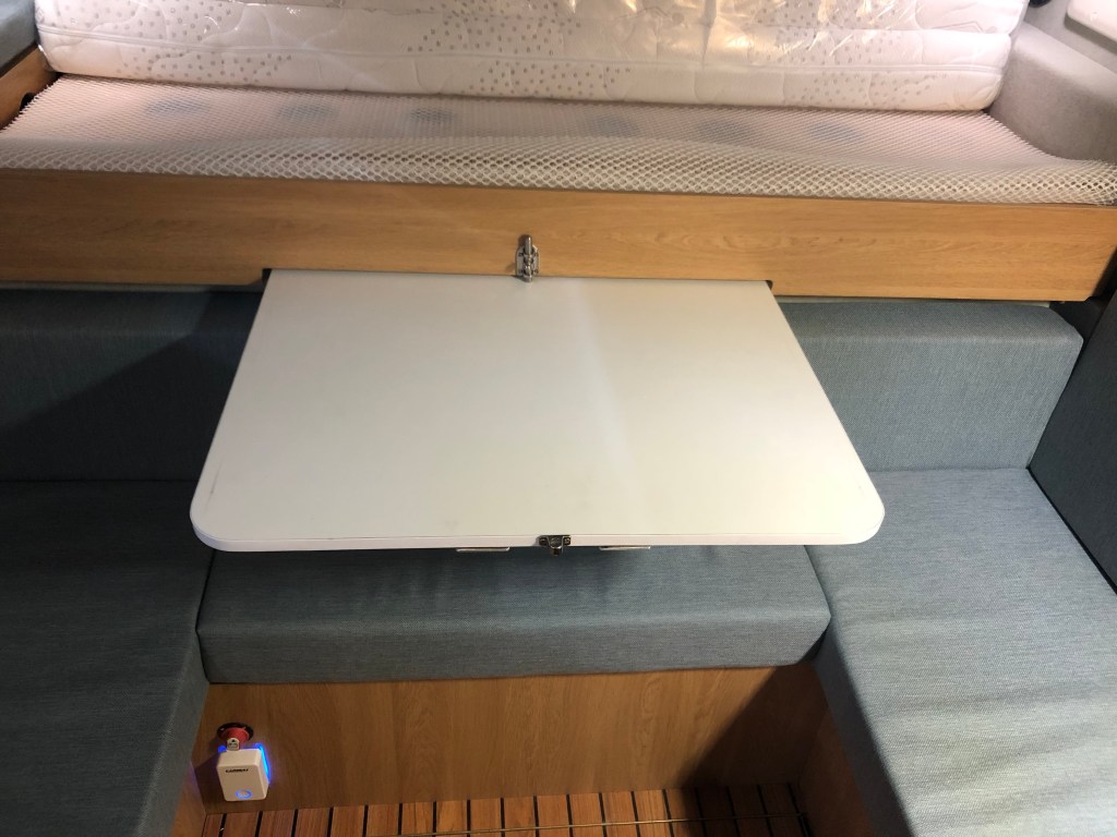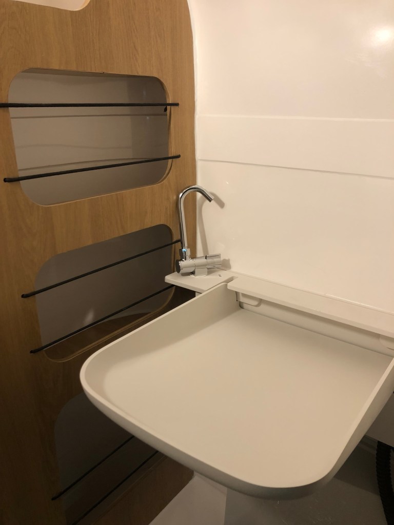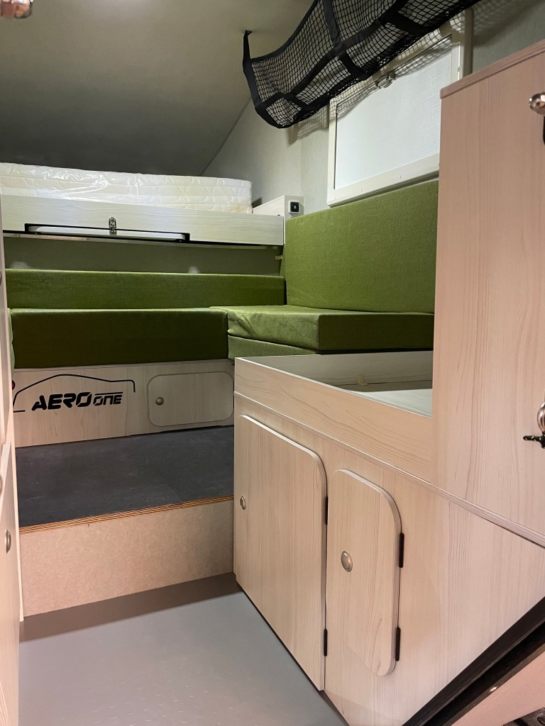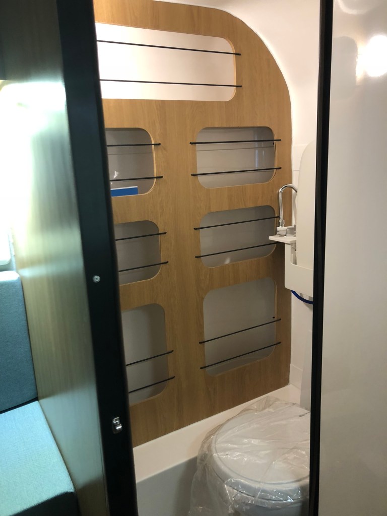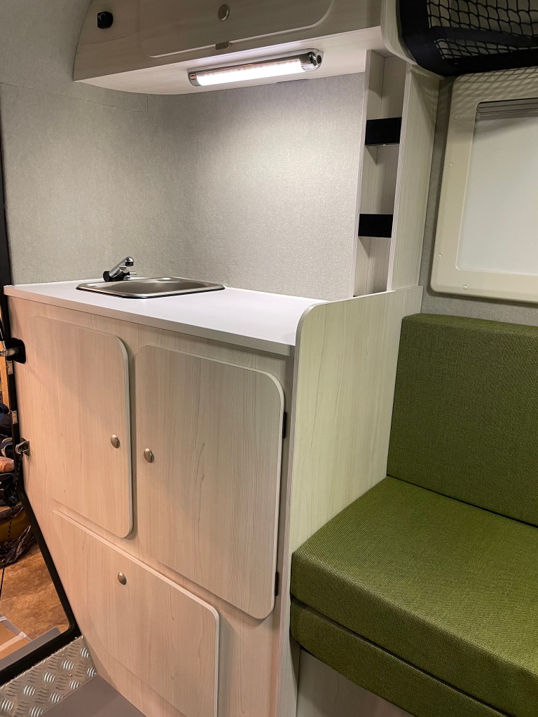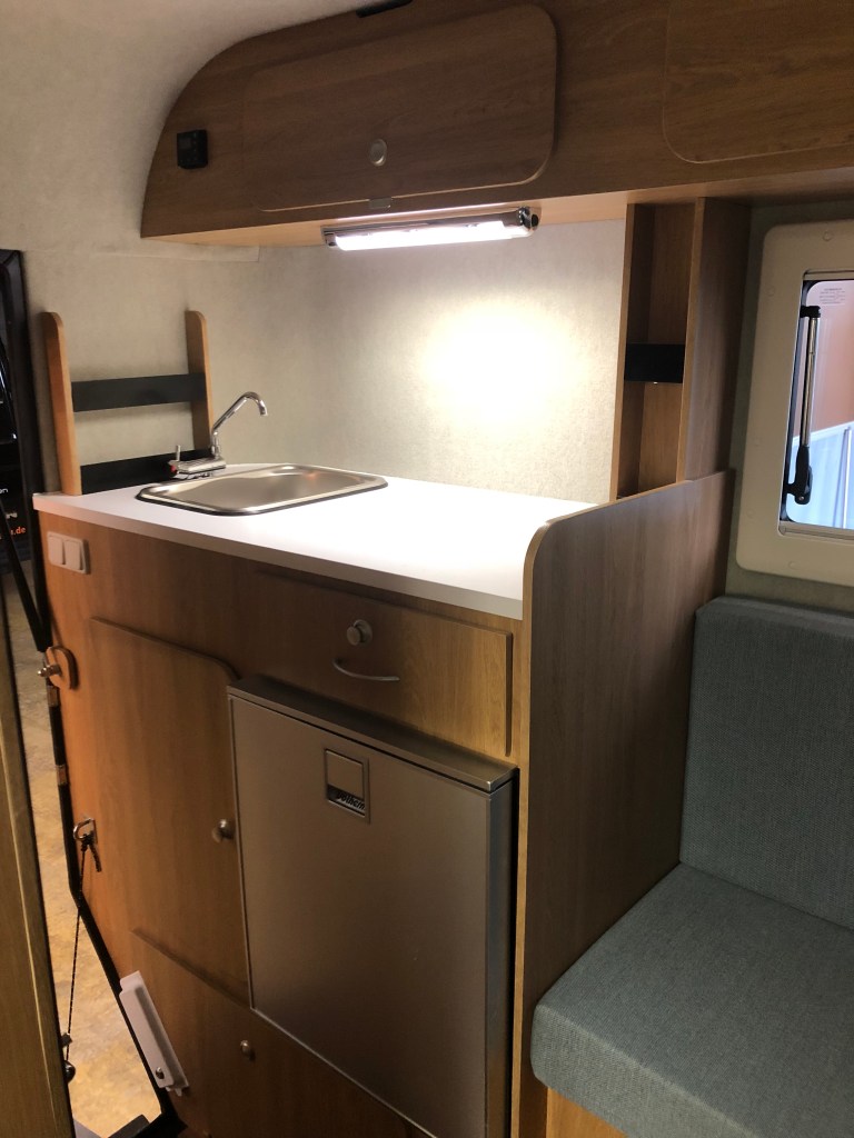 Die Roomtour verwirrt mich etwas. Hatte ich die Camperhit nicht schon mit Bad gesehen? Mit Hängeschränke? Mit Eiche Dekor? Mit edlem Kochfeld? Wenn man die Bilder auf der Homepage von womo4you und die von meinem besichtigten Modell vergleicht, merkt man das man die Aero One in vielen Variationen ausstatten kann.