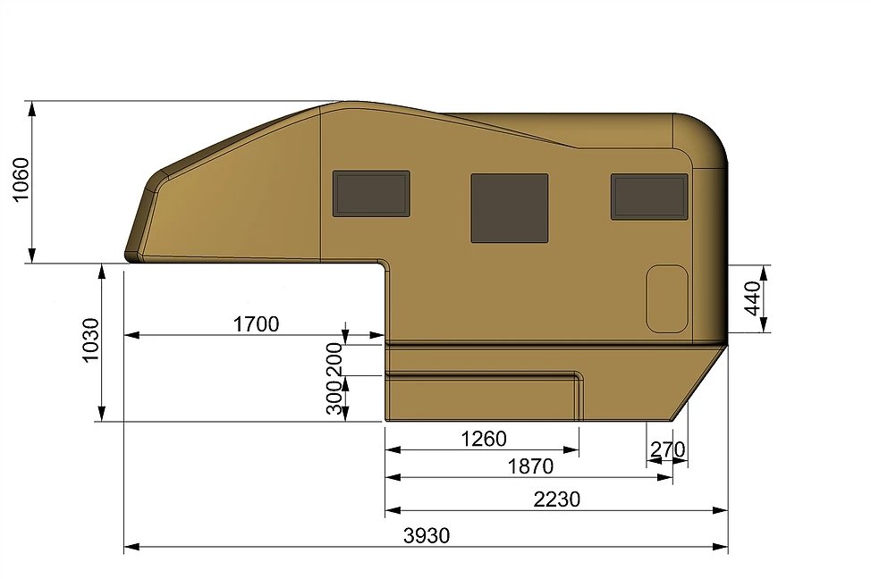 Die Kabine besteht rundherum aus GFK (Glasfaserverstärkter Kunststoff, auch umgangssprachlich Fiberglas genannt). Ein robustes Material, was man seit Jahrzehnten aus dem Bootsbau, von Segel- und Motorflugzeugen, Motorrennsport usw. kennt. GFK Kabinen gibt es einige auf dem Markt ( u. a. Das Fernweh-Mobil, die Gazell usw.) Aber wenige als geschlossene Alkovenkabine ohne Hub oder Klappdach. GFK ist ein optimales Material für den Kabinenbau. Es ist korrosions- und witterungsbeständig und hat eine extrem hohe Festigkeit bei geringem Gewicht. Das Material benötigt wenig Pflege und Instandhaltung. Eine Politur im Jahr ist ausreichend.