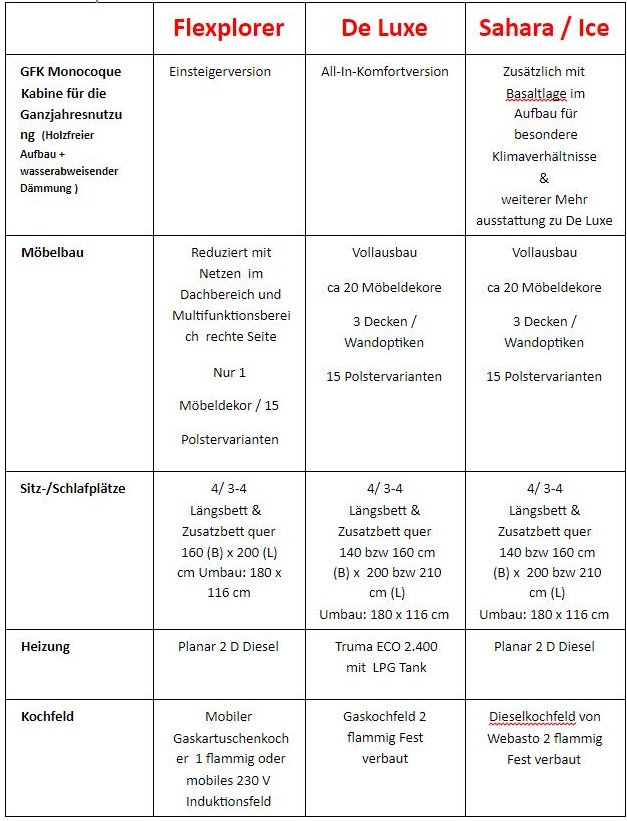 Von einfach, rustikal bis hin zur noblen, edlen Innenausstattung. Frei nach Bedarf und Geldbeutel. Sogar eine sensationelle Isolierung mit dem Namen „Basalt“ kann man ordern. (Sahara/Ice Ausstattung) Nach Kundenaussagen soll es wirklich sensationell sein! Im Sommer bleibt es unglaublich kühl und im Winter hilft es die Wärme in der Kabine zu belassen. Die Sahara / Ice Version ist für extremere Witterungsverhältnisse gedacht. So wird nicht nur die zusätzliche Isolierung verarbeitet, sondern auch ein Dieselkochfeld, dass auch bei extremen Temperaturen funktioniert.