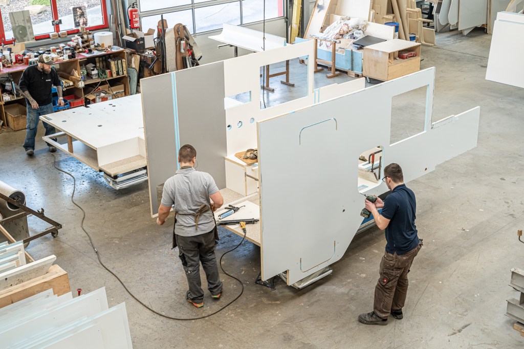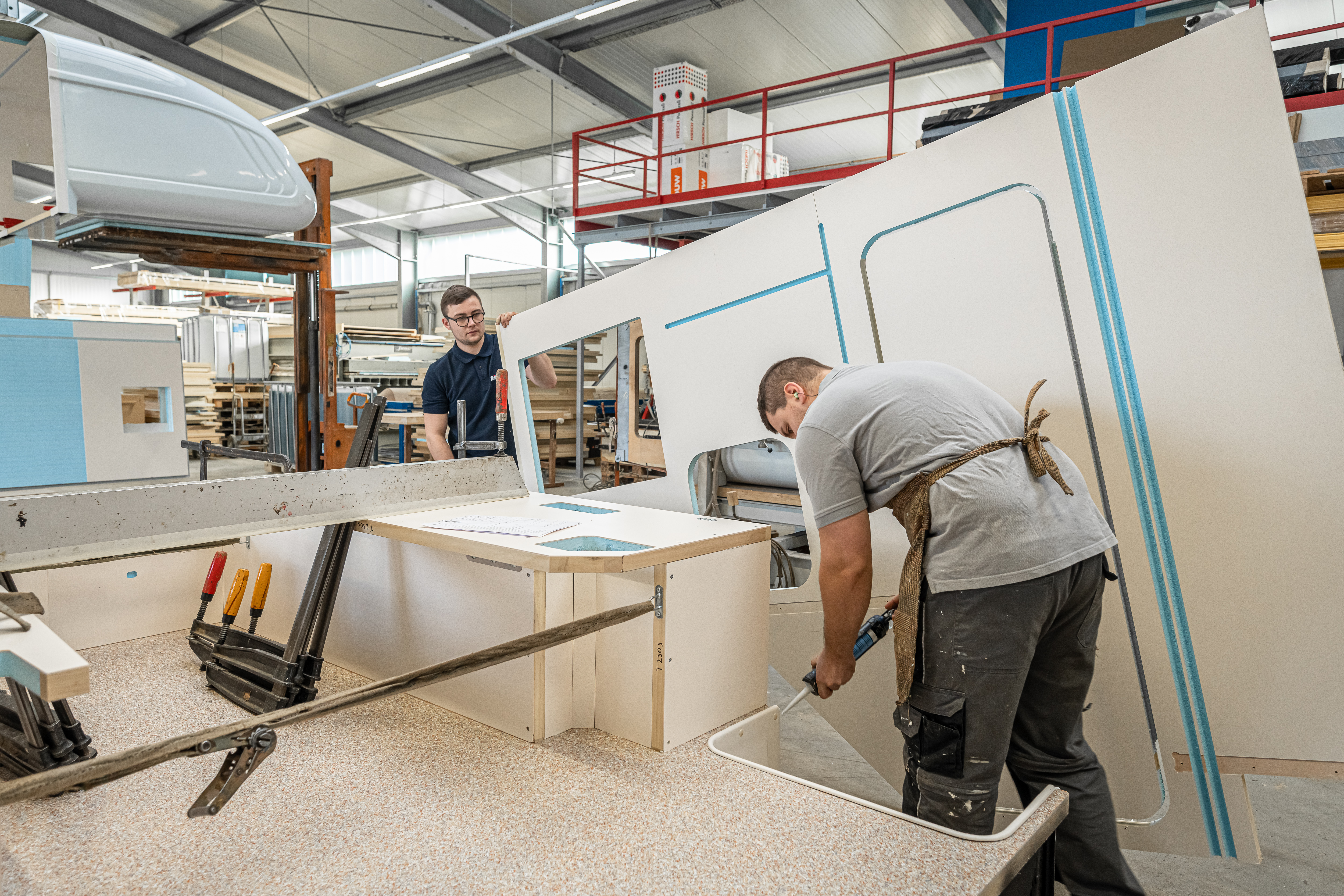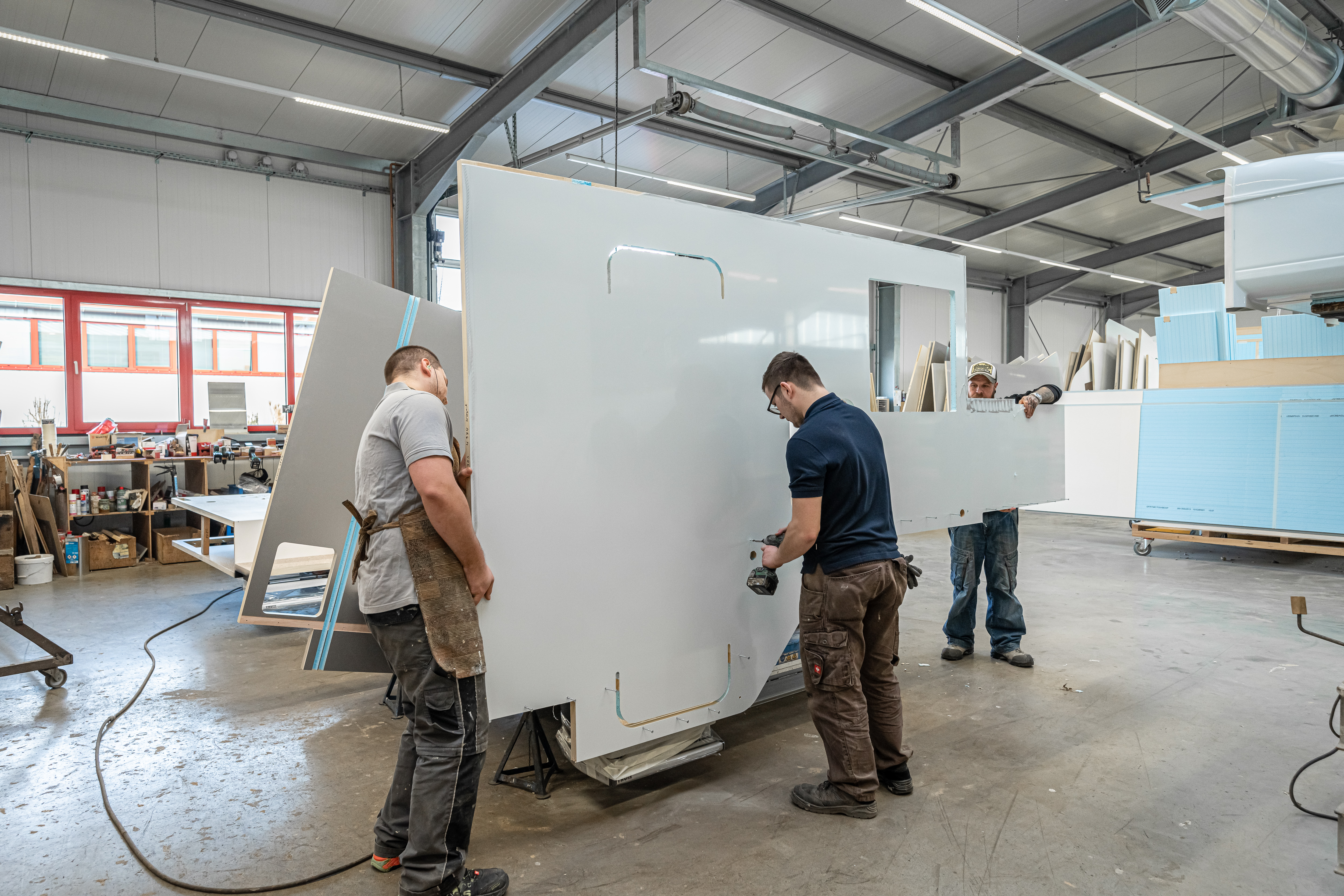 Diesen Aufbau verwenden wir bei allen Modellen. Lediglich die Alkoven-Außenschale der Trail-Kabine wird aus GFK-Bauteilen gefertigt – das ist aufgrund der Form notwendig.