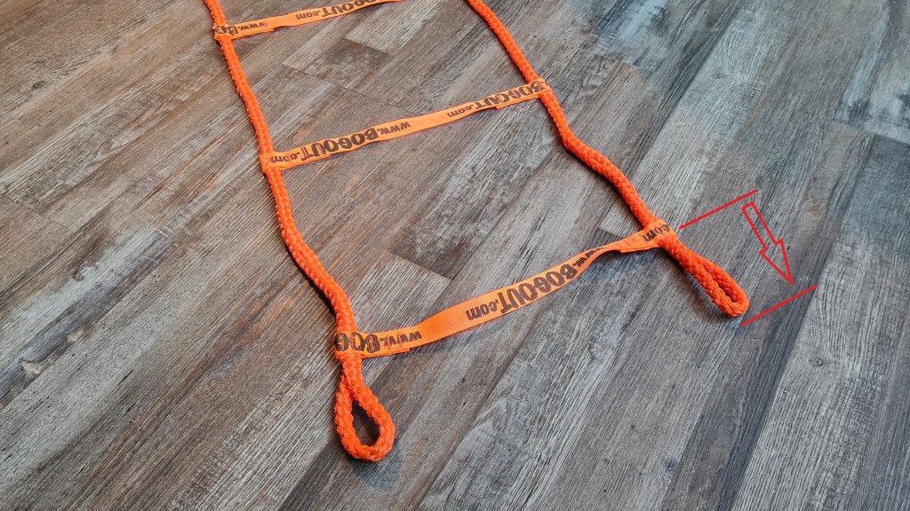 Dazu muss man beachten das der Gurt zur Befestigung oberhalb der Sprosse liegt, damit sich das Bog Out festziehen kann. Wird es wie auf dem Bild gezeigt davor festgebunden, kann es sich nicht festziehen.