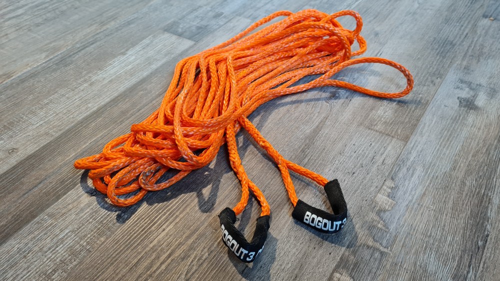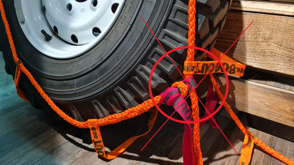Wenn der Weg der Rettung weiter wie 4,5 m liegt , kann man auch zwei Leitern zusammen knoten und erhält dann eine Länge von 9 m. Allerdings muss man schauen, dass der ganze Wust der beiden Leitern, der sich dann ums Rad wickelt, auch Platz in den Radkästen hat und nirgends hängen bleibt und beschädigt wird. Wenn der Untergrund zum Beispiel schlammig ist und beide Räder abwechseln in Bewegung sind, sollte man zwei „Bog Out“ verwenden. Um nach hinten zu Bergen reicht wahrscheinlich ein Exemplar, wenn man über eine Differenzialsperre verfügt. Das entscheidet aber letztlich immer die aktuelle, allgemeine Geländesituation.