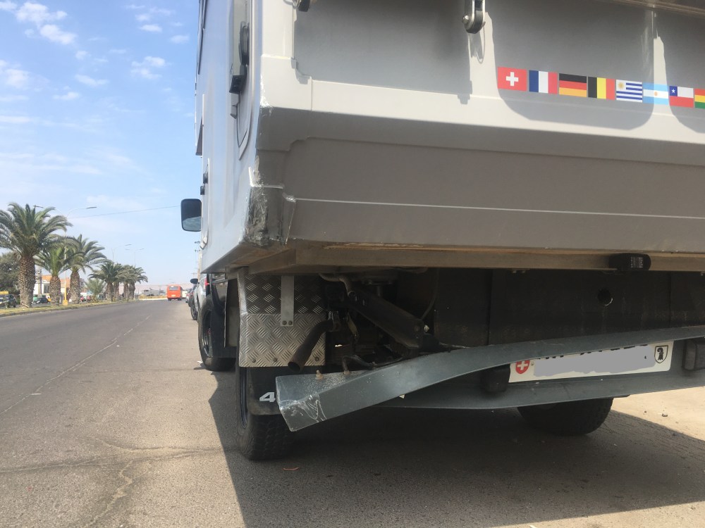 Simon: Ja, das war in Arica/Chile. Wir hatten da ca. eine Woche auf einem Hostel-Parkplatz verbracht, da ich mir in Bolivien eine Lebensmittelvergiftung zugezogen hatte. Nachdem ich endlich wieder fit war, wollten wir uns auf den Weg nach Peru machen. Beim rausfahren aus der Stadt musste ich dann auf der rechten Spur wegen eines Taxis kurz anhalten. Als wir wieder losfahren wollten, krachte es. Ein PKW-Fahrer hatte uns hinten seitlich gestreift und die linke hintere Ecke unserer Kabine beschädigt sowie den Unterfahrschutz inkl. Rücklicht zerstört.