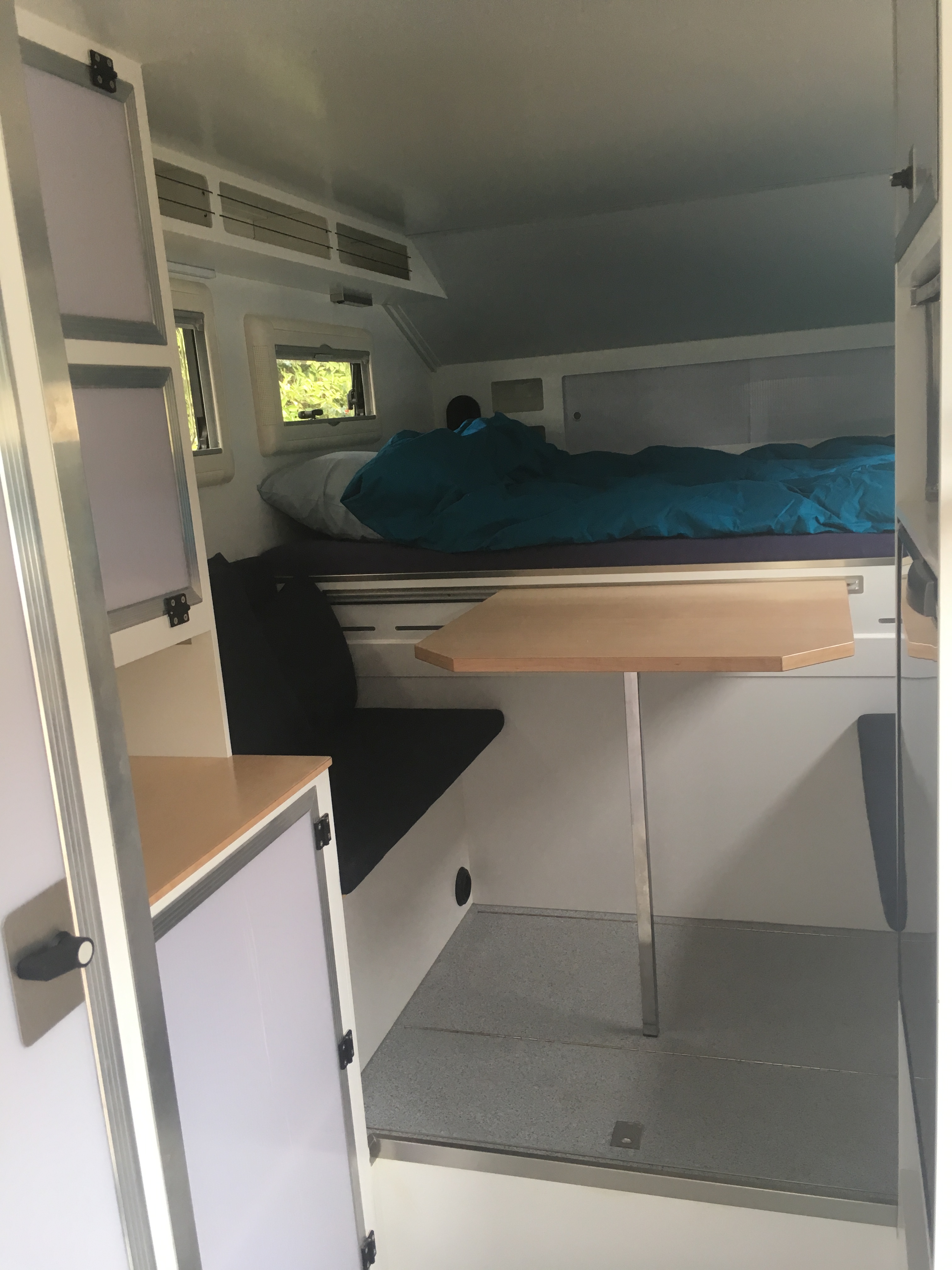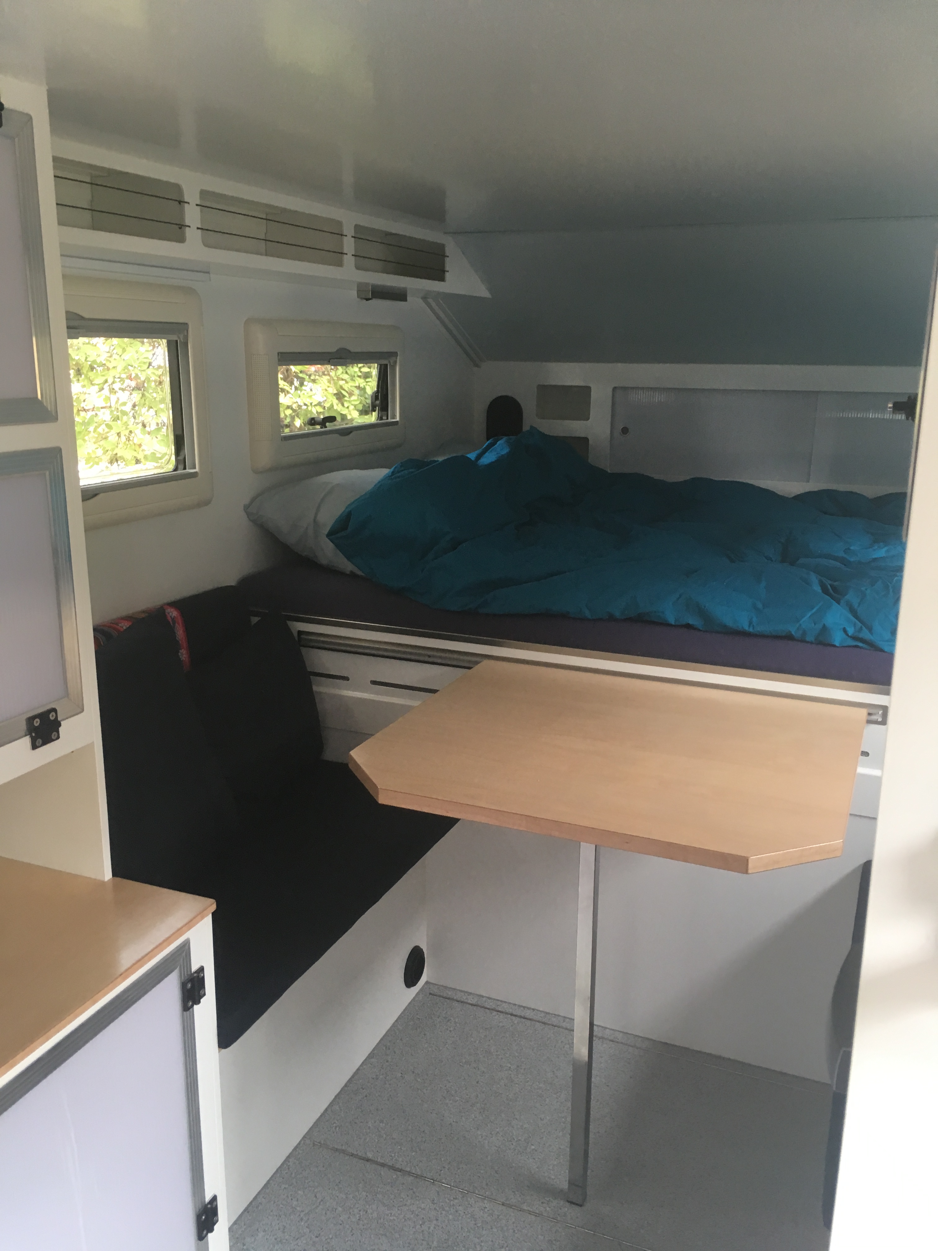 Roger: Wie ich ja von Alex Mehler von nomadcampers.de erfahren habe, hat er ja eure Kabine geliefert. Die genauen Daten, Abmessungen und Aufbau findet man hier im Bericht „Interview mit nomadcampers.de . Seid ihr zufrieden mit dem Aufbau der Kabine? Würdet ihr etwas anders machen?