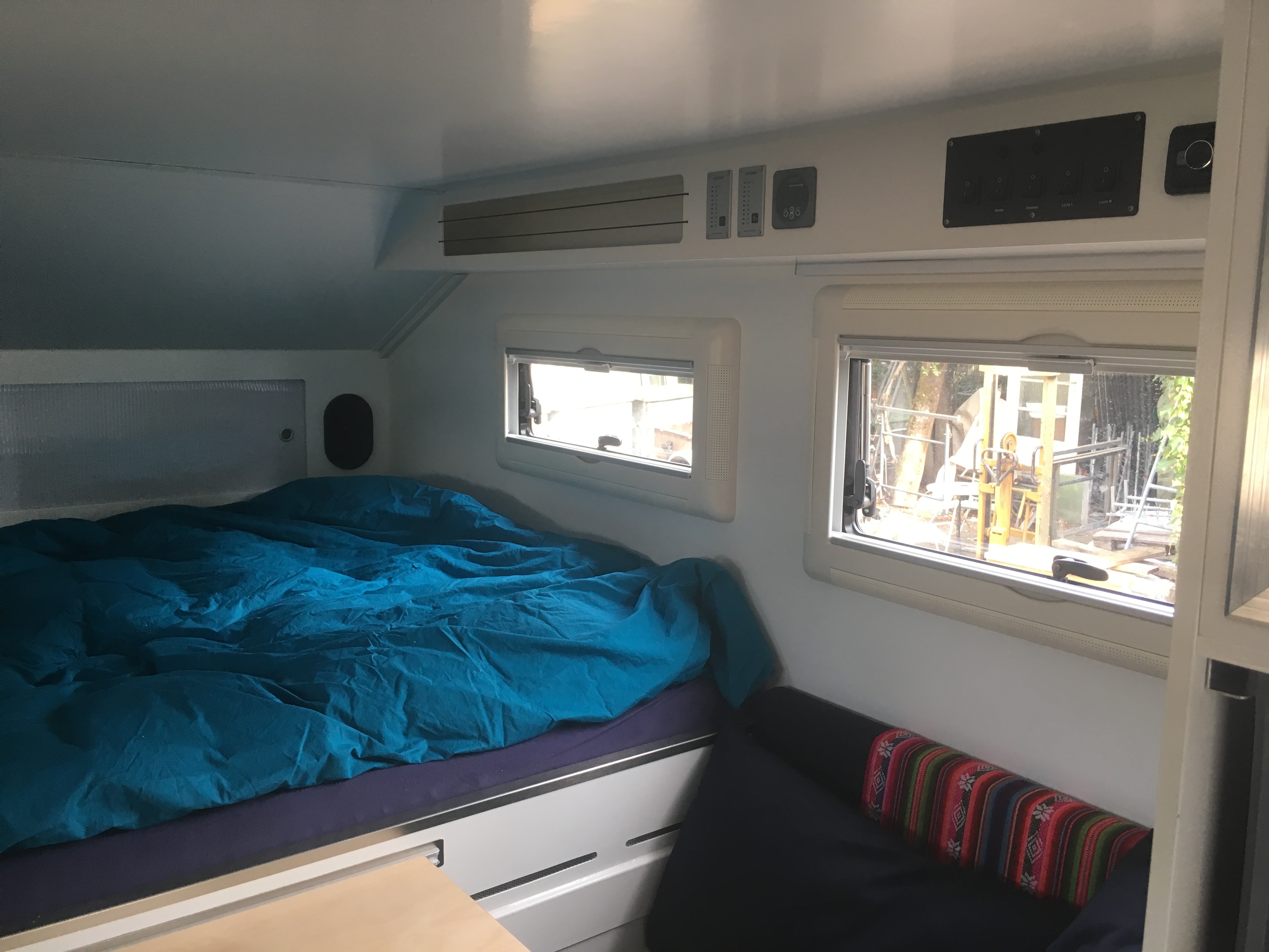 Simon: Den Innenausbau habe ich komplett selbst gemacht. Da wir sehr auf das Gewicht achten mussten, besteht er größtenteils aus furniertem und lackiertem Balsasperrholz. Es ist der klassische Grundriss mit Querbett im Alkoven (135x195cm), Sitzgruppe quer in der Mitte und Dusche/WC sowie die Küche im Heck. Anders machen könnte man natürlich vieles. Ich würde den Fokus bei einem zukünftigen Bau auch hier noch mehr aufs Gewicht richten, da man nie Leicht genug sein kann.