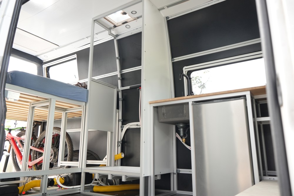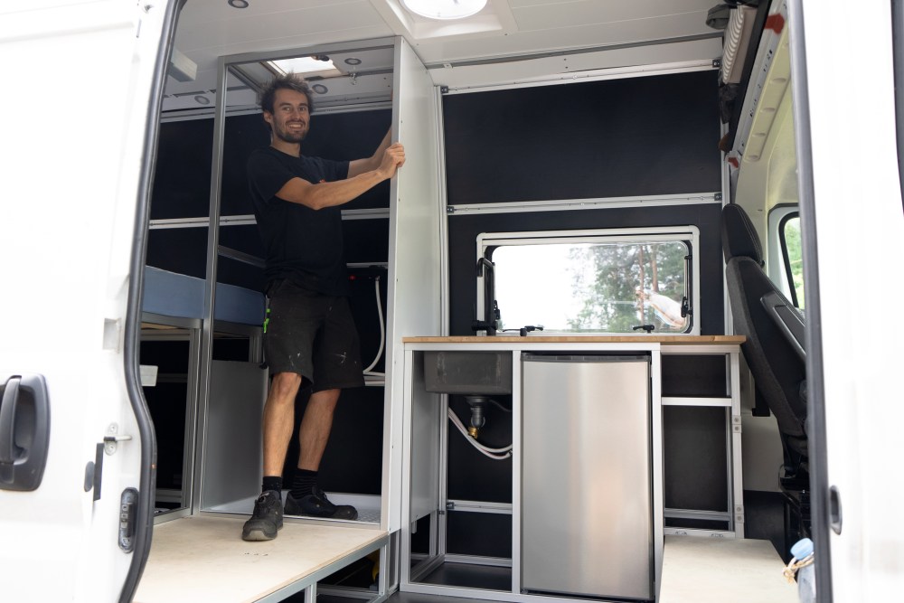 Hier sehen wir ein mal einen Camper Ausbau von Philipp Ritthaler, der sich seinen Fiat Ducato mit dem MiniTec Profilsystem ausgebaut hat. Wir Wohnkabinen Freunde haben es in der Regel noch einfacher, da es sich bei uns meistens um gerade Wände handelt.
