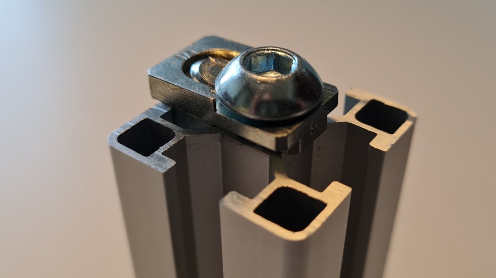 Der passende Profilverbinder 30SF mit selbstfurchender Schraube kann einfach mit dem Akkuschrauber eingedreht werden, ohne dass ein Gewinde vorgeformt werden muss und kostet 3€/Stück.