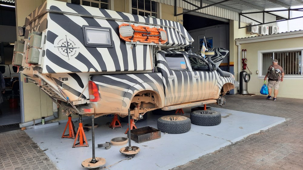 Vido: Dann ging das linke Hinterradlager kaputt, und zwar im Kaokoveld, fernab jeder Werkstatt. Zum Glück konnte ein Mechaniker organisiert werden, der das Radlager auch austauschen konnte, aber leider nicht richtig… Nach 2.000 Kilometern war das Radlager wieder im Eimer, und weil das nicht reichte, waren auch die hinteren Steckachsen durch die mangelhafte Reparatur hinüber. Zum Glück passierte uns das in der Nähe von Windhoek, aber die Teile waren in Namibia nicht vorrätig und mussten aus Südafrika geschickt werden, das dauert natürlich alles seine Zeit. Dann hatten wir noch Probleme mit der Klimaanlage, der Bremstrommel hinten links, dem Mittellager des Kardangelenks und des Kreuzgelenks, eine mausetote Batterie im Addo Elephant-Park. Zwischenzeitlich haben wir dem Zebra gedroht, es anzuzünden, wenn es weitere Probleme gibt. Und dabei war der Hilux richtig gut gewartet und vorbereitet. Ständig wurde alles geprüft. Dann ist es umso enttäuschender wenn derart viele Probleme auftauchen.
