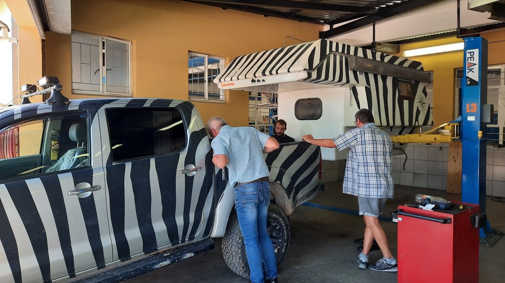 Vido: Ach, das war tatsächlich ein Mega-Frust! Nach der Skeleton-Coast-Tour habe ich festgestellt, dass unsere Ladewanne gerissen war. Das mag schon vorher irgendwann mal seinen Anfang genommen haben, aber auf den afrikanischen Straßen ist der Riss immer weitergewandert. Und an der Ladewanne hängt die Fernweh-Mobil-Kabine, da ist es wirklich wichtig, das zu reparieren, bevor wir unser Schneckenhaus verlieren. Wir waren in mehreren Werkstätten, die das Problem zwar verstanden haben und auch entsprechende Reparaturen vorgenommen haben, aber der Riss ging trotzdem weiter. Schließlich landeten wir zum Glück in Windhoek, wo die Kabine abgenommen werden konnte und eine Stahlstrebe angeschweißt und angeschraubt wurde, um die Ladewanne stabil mit dem Fahrzeugrahmen zu verbinden.