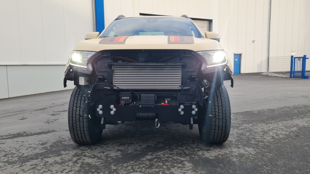 Dann wird die komplette Front entfernt. Hier wird eine Seilwinde ihren Platz finden. Die Firma Hurter bietet einen komplette Seilwindenanbausatz mit integrierten Unterfahrschutz an (Professional Winch 6.1 t) . Außerdem wird eine GFK Front verbaut, die an einen Ford Raptor erinnert. Mittlerweile auch ein großes Problem: In der Front sitzen allerlei Sensoren für allerlei Gimmicks. Abstandswarner, Parksensoren etc. Hier hat die PWS Offroad die Aufgabe, alles so zu verbauen, dass die moderne Elektronik auch später weiterhin tadellos funktioniert. Auch der Freilauf der Winde muss per Hand erreichbar sein. Was nach Plug and Play aussieht täuscht. Das alles, ist mit viel Anpassungsarbeit verbunden.