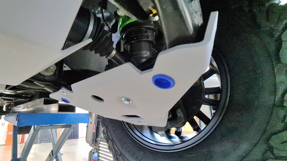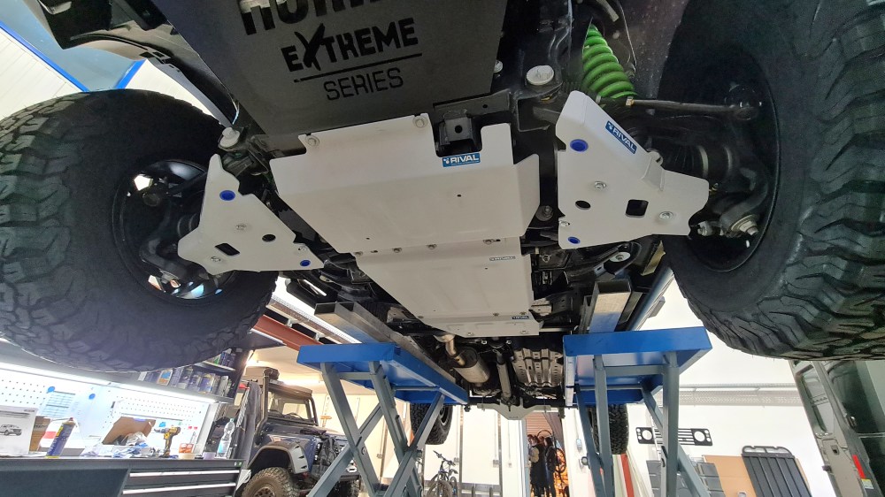 Und damit das Fahrzeug von unten gegen Steine und Felsen gut geschützt ist, wird das komplette Unterfahrschutz Set von Rival verbaut. Das Ganze aus 4 und 6 mm Aluminium.