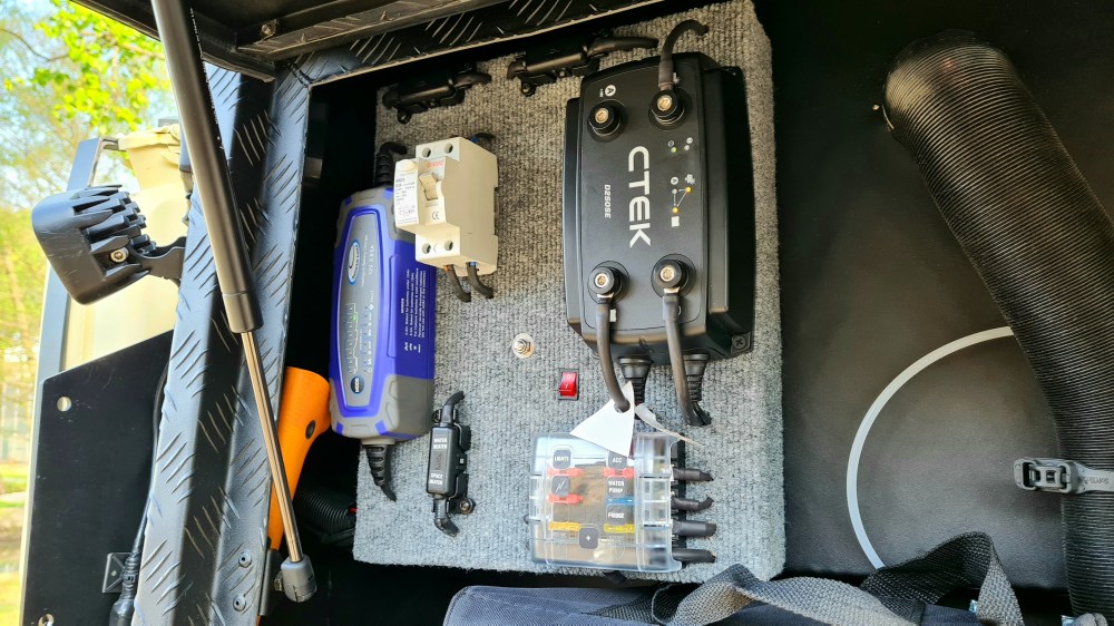 Für die Stromversorgung sorgt unter anderem ein 150W Solarpaneel auf dem Dach. Zusätzlich gibt es bei Bedarf den Zugang von 230V Landstrom und die Versorgung über ein Batteriemanagement von der vorderen Lichtmaschine.
