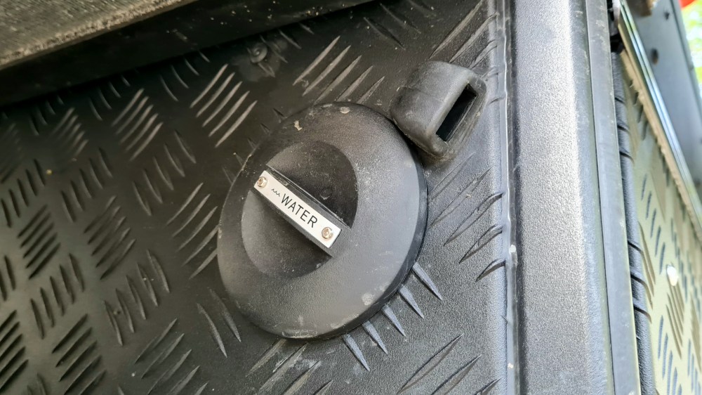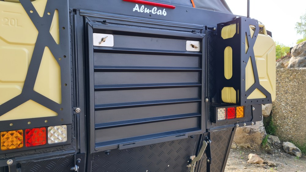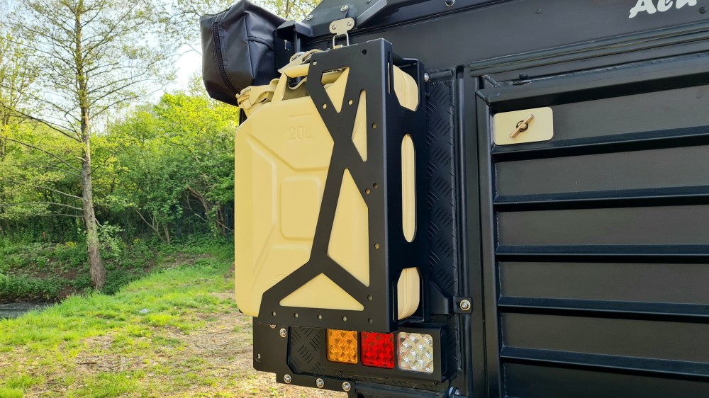 Zu der Khaya Camper gibt es eine lange Zubehörliste, allerdings ist sie in der Grundversion schon reisefertig. Optional sind zum Beispiel die zwei Trinkwasser oder Diesel Kanister am Heck. In dem Fall hat die der Besitzer in Wagenfarbe lackieren lassen und wurden so ein optischer Leckerbissen