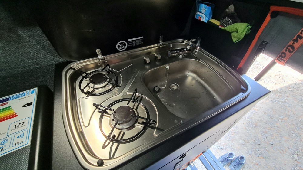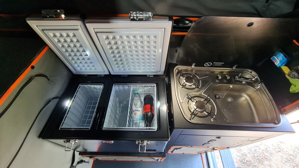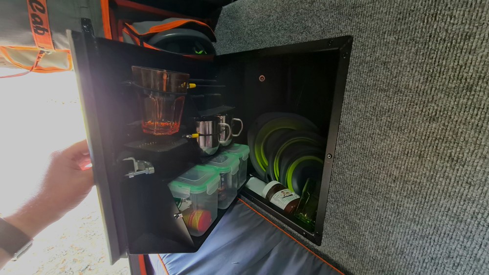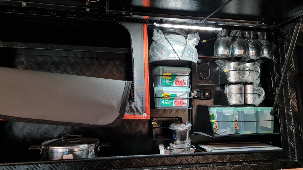 Im hinteren linken Außenfach befindet sich eine vollständige Kochausrüstung mit allem was man braucht: Geschirr- und Besteckset, faltbarer Kaffeetisch zum seitlichen einschieben und vieles mehr. Die Khaya Camper ist als praktisch reisefertig ausgerüstet.