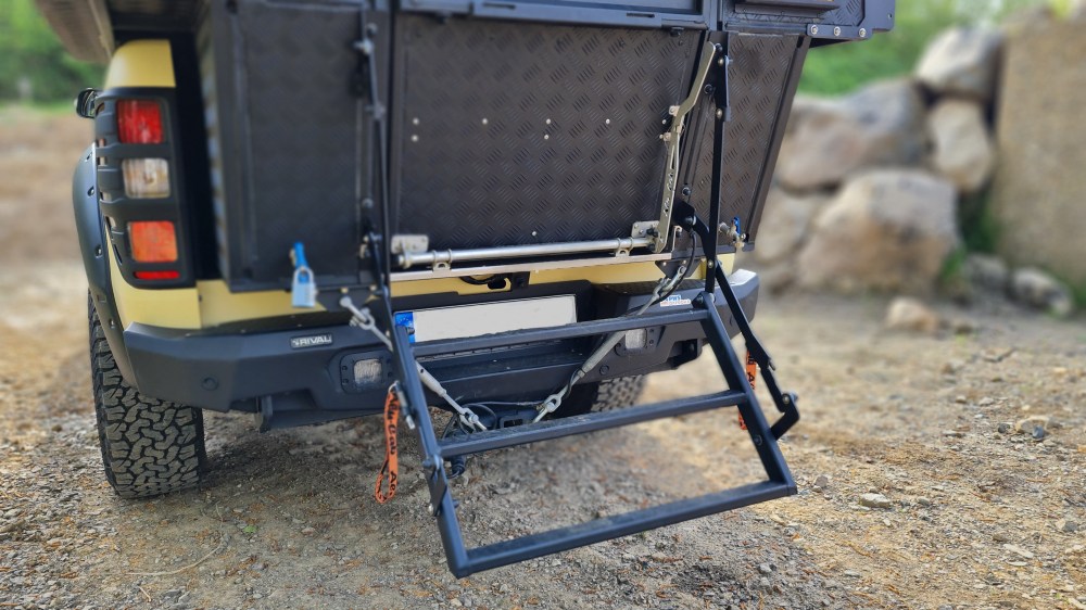 Um nun in das Innere der Khaya Camper zu kommen, klappt man die massive Leiter herunter.