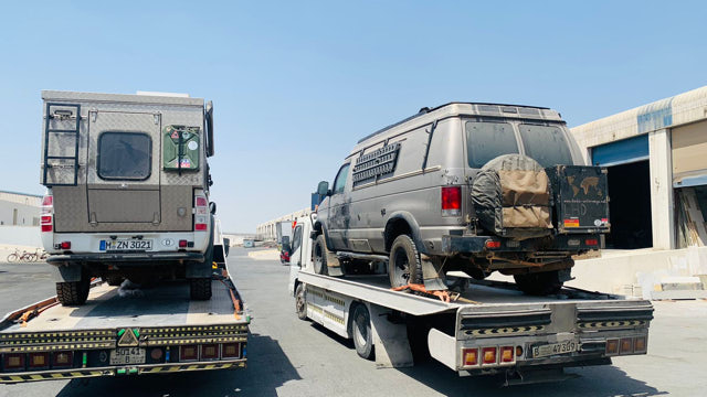 Der funktioniert und gegen Mittag treten zwei Transporter mit unseren Autos die 2.000 Kilometer lange Reise quer durch die Wüste an. Sofort informieren wir die Agentur in Dubai, dass in etwa drei Tagen mit der Ankunft unserer Fahrzeuge zu rechnen ist, sofern an der Grenze alles gut geht.