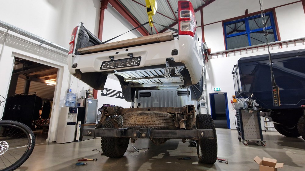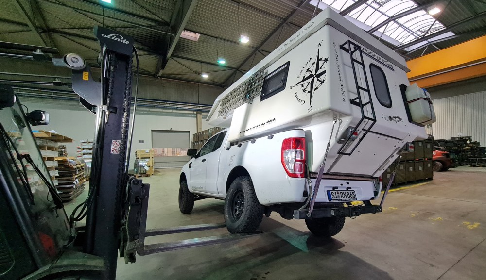 Bevor es zur finalen Planung der neuen Kabine geht, mache ich folgenden Versuch: Ich hebe mit einem Gabelstapler und voller Beladung mein Fahrzeug maximal einseitig am Hinterrad in die Höhe. Der Grund: Ich möchte keine Radkästen in die neue Kabine bauen und will somit messen, ob der Platz zwischen Rad und Kabine in der maximalen Verschränkung des Fahrzeugs ausreichend ist. Es ist wesentlich weniger, als ich befürchtet habe und eigentlich auch logisch. Eine Blattfeder – in meinem Fall eine Schwerlastfeder von Ironman – kann sich ja gar nicht wesentlich nach oben verbiegen. Rechnet man die Neigung heraus, die das Fahrzeug in sich verwindet, bleiben weniger als 10 cm, die sich das Rad nach oben bewegt. Sollte es wider Erwarten nicht reichen, könnte ich immer noch einen Radkasten von ein paar Zentimeter in die 5 cm starke Bodenplatte fräsen. Oder den Federweg begrenzen.