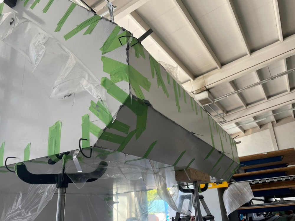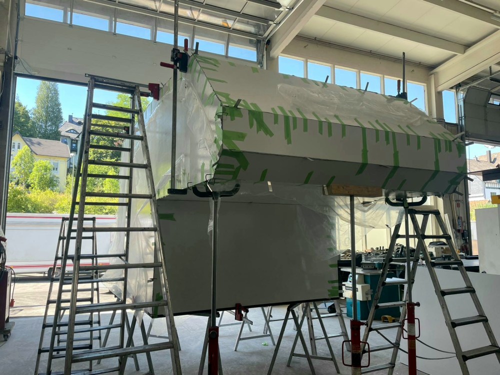 Dann folgt 30 mm Polyurethan-Hartschaum mit einem Raumgewicht von RG50. Und für den Innenraum eine Low Emission, fein-gewebeverstärkte Beschichtung von ca. 0,7 mm. Das Material soll verhindern, dass es im Innenraum intensiv nach GFK bzw. Harz riecht.
