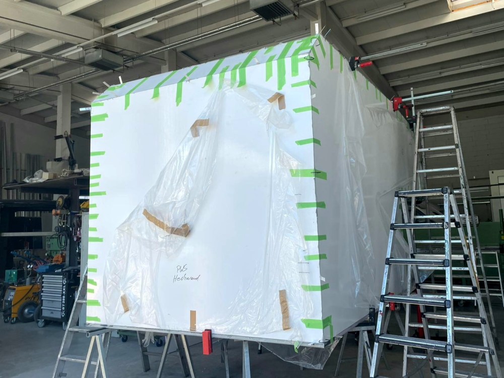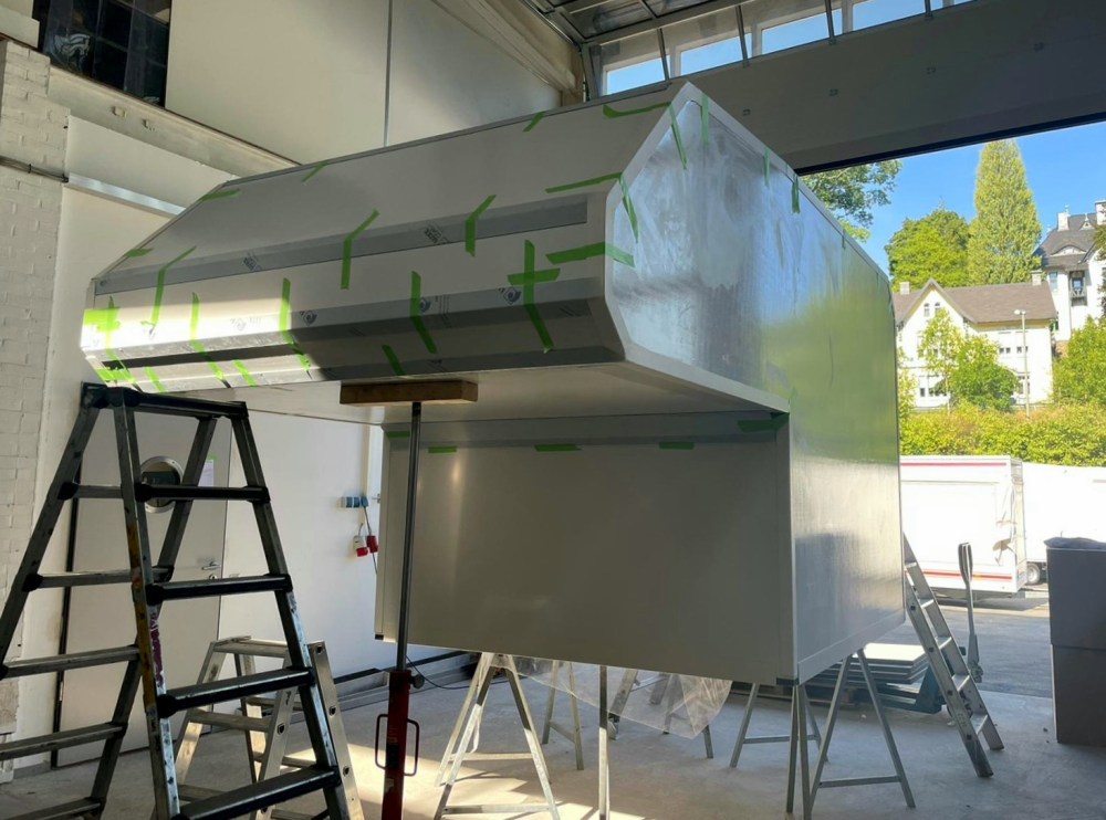 Dann heißt es kleben, warten, kleben, warten, kleben, warten … Das Material zum Kleben wird mitgeliefert und man sollte sich genau an die angegebenen Zeiten, Klebedicken, Temperaturen, Vorarbeiten mit Primer usw. halten. Denn alle Materialien sind aufeinander abgestimmt. Mangels Zeit und Platz lasse ich die Arbeiten bei der befreundeten Firma 4xQuadrat durchführen, die einen super Job machen. Kein Wunder, denn sie fertigen sonst LKW Kabinen aus GFK und wissen, was sie tun. Ausschnitte für die Fenster sind später nach der Lackierung geplant.