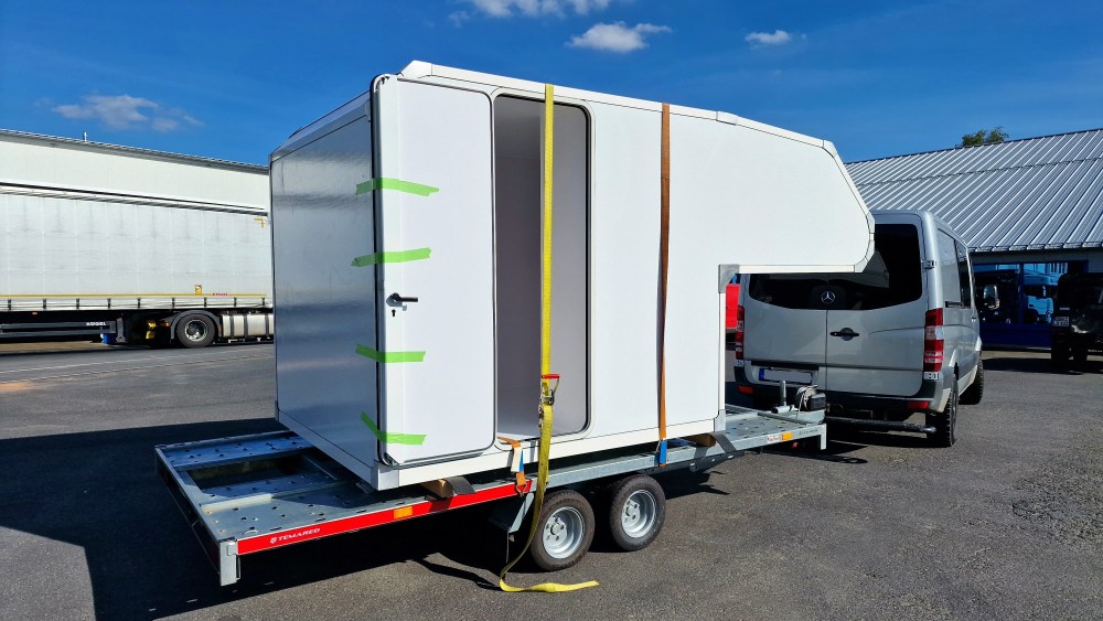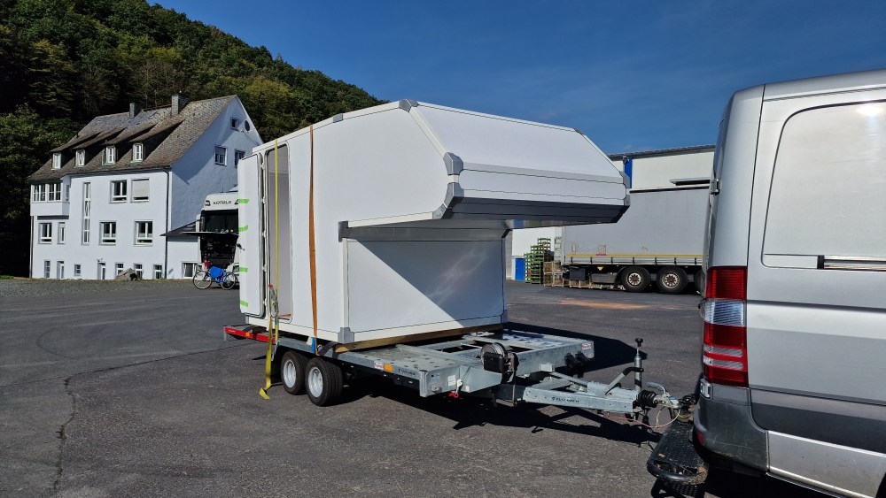 Nach rund 3 Wochen kann ich meine fertige Leerkabine abholen. Die Türe habe ich bewusst größtmöglich gewählt. Ich mag es nicht, wenn man beim Einsteigen in die Kabine den Kopf einziehen muss oder beim Einsteigen den Körper verdrehen muss, damit es passt. Außerdem bringt es Licht und Luft in den Raum. Der thermisch entkoppelte Alurahmen der Türe sorgt wieder für Stabilität auf der Seite.