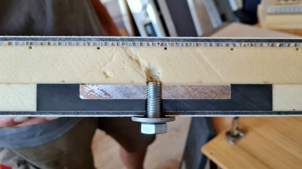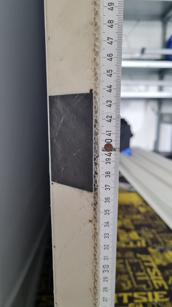 Apropos Bodenplatte: Diese besteht aus verschiedenen, holzfreien Lagen und bietet maximale Stabilität mit leichten Materialien. Die Kanten sind stufig gefräst, sodass die Seitenteile drauf geklebt werden können. Das ergibt maximale Stabilität, wenn die Seiten auf dem Boden stützen. Ich habe mir die Platten klebefertig und passgenau von nomadcampers schneiden lassen. Das kann man optional wählen und kostet einen Aufpreis. An den jeweiligen 4 Ecken lasse ich mir noch schraub fähige Einleger mit Aluminium Kern mit einlaminieren, denn der Hilfsrahmen soll nicht nur geklebt, sondern auch geschraubt werden.