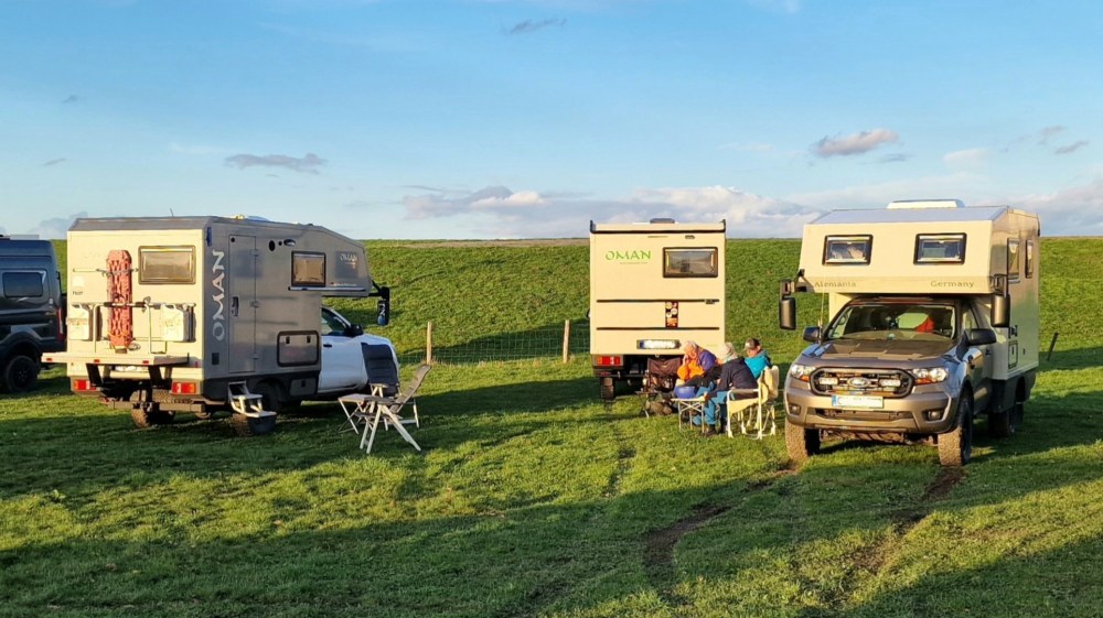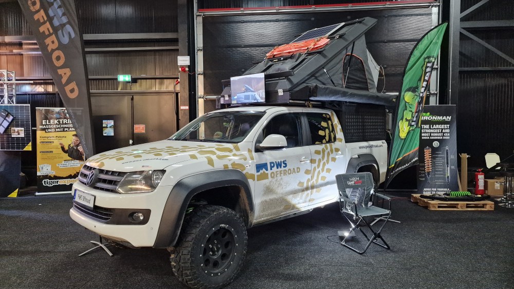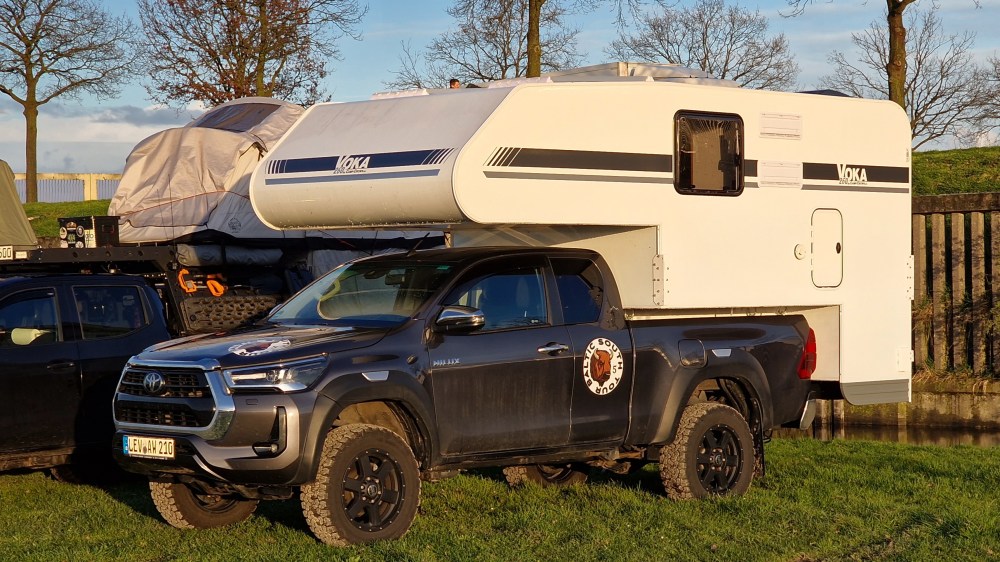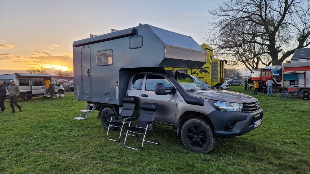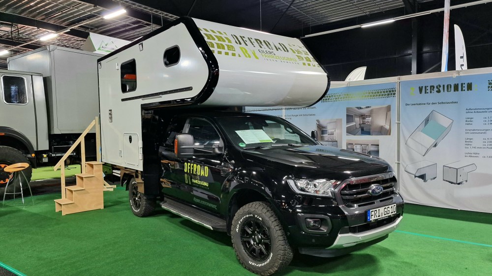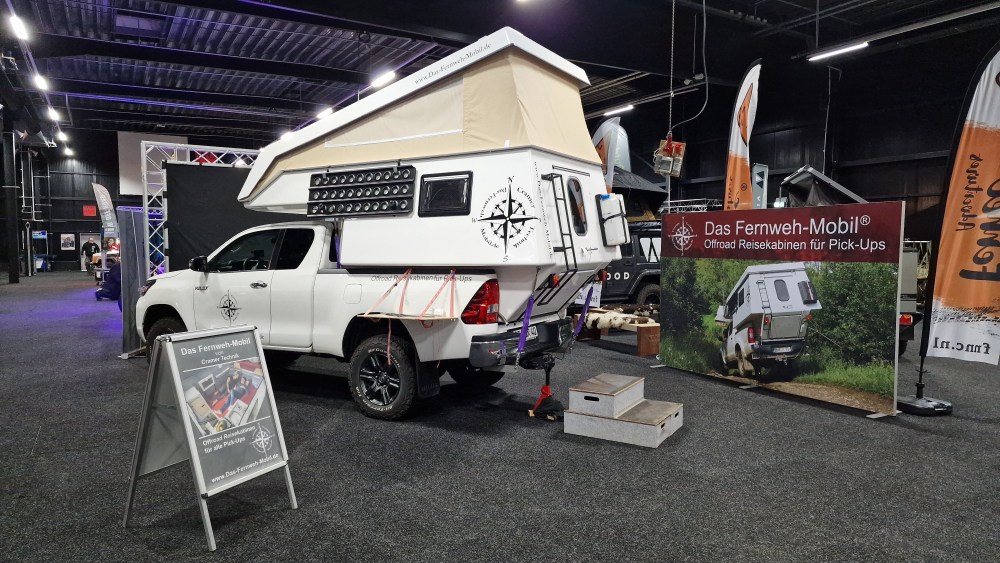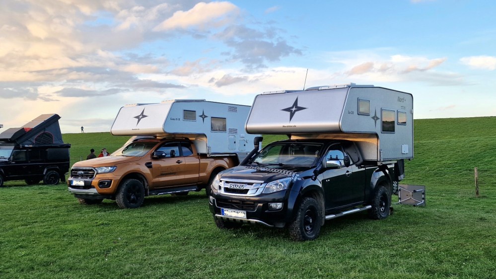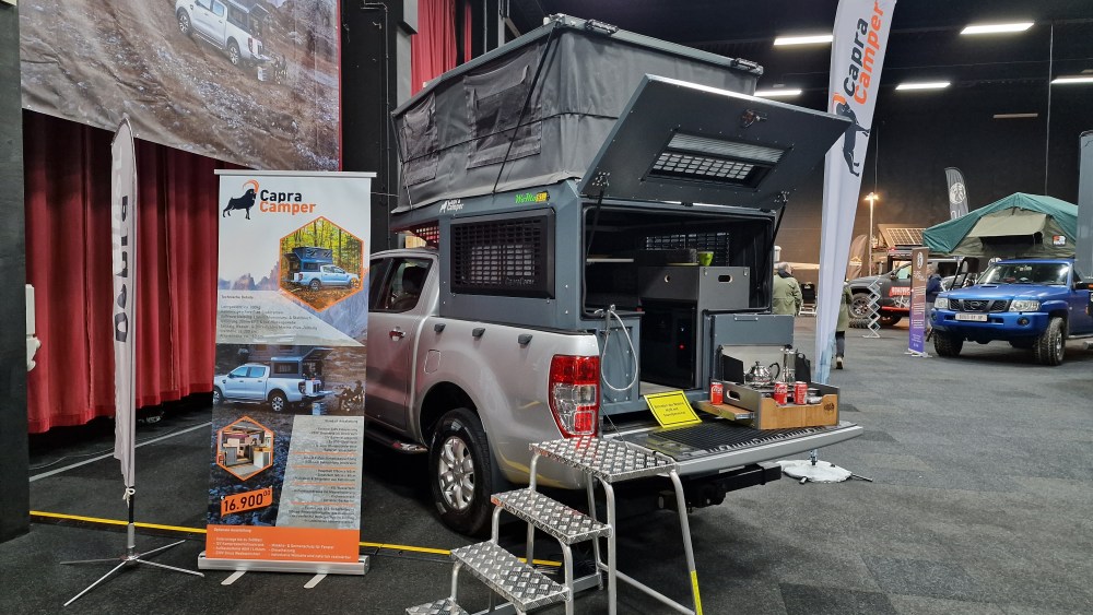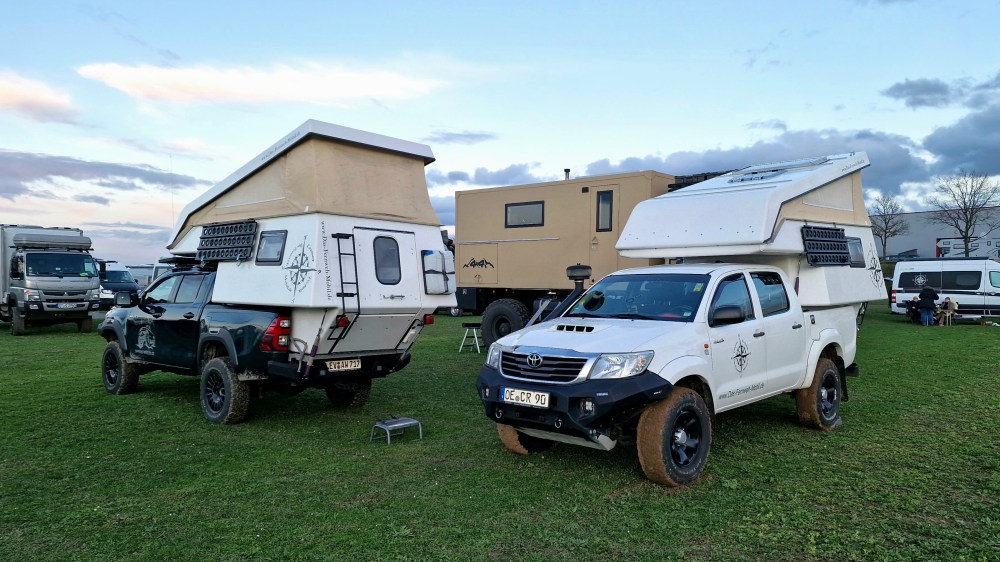 Die Markisen mussten sehr gut abgespannt werden. Wie hier an der Thokie Wohnkabine. Am Donnerstagabend war die Welt noch in Ordnung und der Himmel blau.Eine ExKab, typisch, mit Alu Riffel, aber mit ungewöhnlicher Form. Erinnert stark in der Form an eine Monocoque GFK Kabine a la Azar oder Geocamper.Und hier das neue Ding von Jens Heidrich vom Wohnkabinencenter aus Gevelsberg. Eine Voka mit 260 Bodenlänge. Eine preisliche, attraktive, Alternative zu einer Nordstar und anderen Alkoven Kabinen. Demnächst gibt es mehr über das neue Dickschiff zu erfahren. Denn der Pickup unter der Kabine gehört Andreas „Wikinger“ Kirsch vom Pickup Camper Magazin, der mit der Kombi zurzeit auf Probefahrt ist.Erwischt, der Wikinger beim (wohlverdienten) Feierabendbier in geselliger Runde. Da war es noch gemütlich, an den anderen Abenden wurde es frisch und stürmisch.Sofort am Nordstern erkannt.Eine Tischer-Kabine in Abendstimmung.Auffällig stark vertreten in diesem Jahr: Die Burow Oman in Front, Heck und Seitenansicht.Und natürlich darf Benno Cramers Fernweh Mobil nicht fehlen.So gehts natürlich auch…Und auch die Rickerts sind wieder dabei. Heike und Matthias aus dem Siegerland. Diese Wohnkabine war mit ein Grund und Ideengeber, mein neues Projekt in die Tat umzusetzen. Deshalb gibt es viele Gemeinsamkeiten und ich konnte mir in der Vergangenheit einige Tipps von Matthias und Heike geben lassen. Den ganzen Bericht zu ihrem Bau findet ihr hier: Abenteuer KabinenbauSchon Freitag füllten sich die Gänge und am Samstagmittag waren die Messehallen richtig gut gefülltDownsizing: Es muss ja nicht immer der große Geländewagen sein…. Die Fa. Eilers aus Varel zeigt eine neue Alkovenkabine. Da sie aus dem Fahrzeugbau entstammen, ist das Konzept in vielen Details ganz anders als die typischen Kabinen in dieser Größenordnung. Ich denke, in Zukunft wird man noch öfters davon hören.Die PWS Offroad GmbH zeigte Ihren Amarok mit Bodylift und Ironman Fahrwerk mit einem Alu Cab Canopy Camper. Natürlich mit der freitragenden 270° Markise.Die Firma Cramer Technik mit dem Fernweh Mobil auf einem neuen Toyota Hilux der Firma Weigler aus LeverkusenStefan Decker kommt frisch aus einem Abenteuerurlaub aus Algerien zur Messe und zeigt sein modulares System aus Tray, Box und Tent, welches sich individuell anpassen kann. Alles ist beliebig kombinierbar.Klein und leicht und Offroad tauglich: Der Capra-Camper, der „Steinbock“ aus der Türkei. Eine Pop-up Kabine für Doppelkabiner. Die 350 kg auf der Ladefläche machen sich im Fahrverhalten eines Pickups kaum bemerkbar. Die Maße des Pickup-Campers vergrößern die Maße des Rangers kaum und erlauben dadurch vollen Offroad Einsatz. Durch den Mix aus Alu und Stahl ist sie äußerst robust.Besuch am Nachmittag: Andreas „Wikinger“ Kirsch vom Pickup Camper Magazin besucht mich für einen kleinen Erfahrungsaustausch, um die Zusammenarbeit von wohnkabinen.online und dem Pickup-Camper Magazin weiter zu intensivieren. Pepec – Qualität made in Germany. Peter Schmidt konstruiert und verkauft seit 2017 ein modulares System. Er hat seine beruflichen Wurzeln im Rennsport und das merkt man in der Verarbeitung seiner Produkte. Grundstein ist die Ladefläche aus Alu, die oberhalb der Radkästen sitzt. Darauf kann man im Wechsel Bordwände oder diverse Aufbauten schnell montieren. Vom Arbeitstier zum Reisemobil in wenigen Minuten.Bisher kannten wir uns nur vom Telefon: Peter Pfeiffer vom Schaumstoff Center Schomerus aus Bad Endbach und Frankfurt. Er sorgt in Zukunft dafür, dass ich in meiner neuen Kabine gemütlich sitzen kann. Und die Polster wurden sogar persönlich geliefert und machen einen sehr hochwertigen Eindruck. Ich bin gespannt und werde nach der ersten Tour berichten.