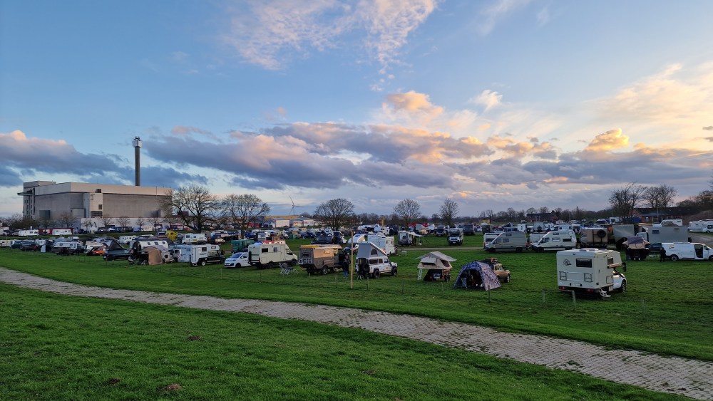 Abendstimmung am Rhein im Grenzgebiet zu den Niederlanden direkt am Campground. Dort wird der Mündungsarm Waal genannt. Daher der Name der Messe, über den sich manch Deutscher wundert.Das Camp füllt sich. Mittlerweile nicht nur als Messe beliebt, sondern auch als Treffen von Offroad Reisenden aller Couleur etabliert.Bei solchem Sturm zeigen sich die Vorteile der Pickup Camper und die Nachteile von Dachzelte. An ruhigem Schlaf im Dachzelt war dabei nicht zu denken. So manche Markise wurde am Wochenende ins Nirwana befördert.