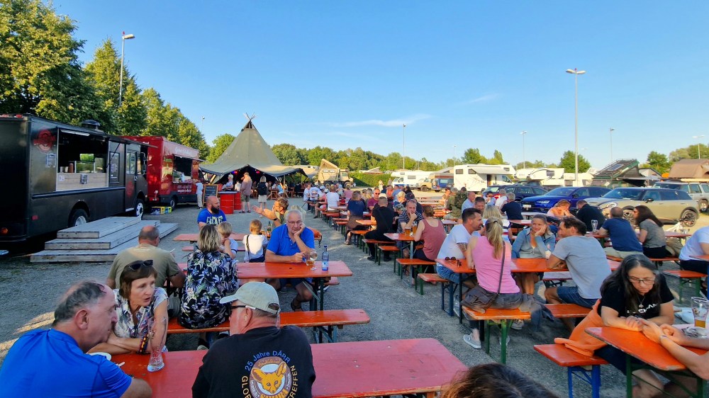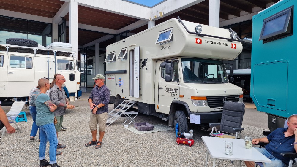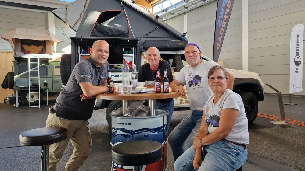 Abends gibt es wie immer ein Feierabendbier und lange Gespräche. Hier mit dem Schweizer Rene Schmid vom YT Kanal „womo-adventure“ und Sabine und Burkhard Koch von der „Pistenkuh, die auf dem Stand der PWS Offroad ihre Reisebücher verkaufen und zum Plausch für alle Reisebegeisterten zur Verfügung stehen.