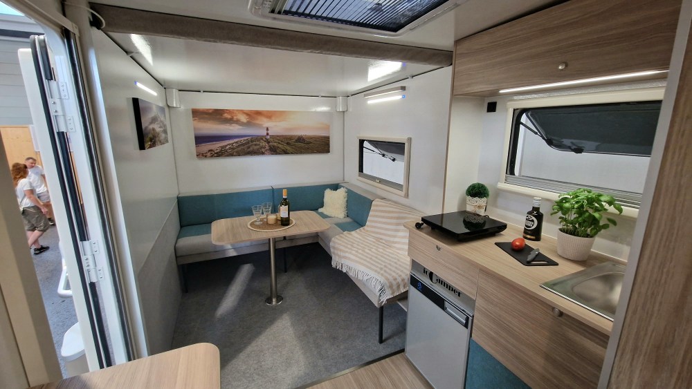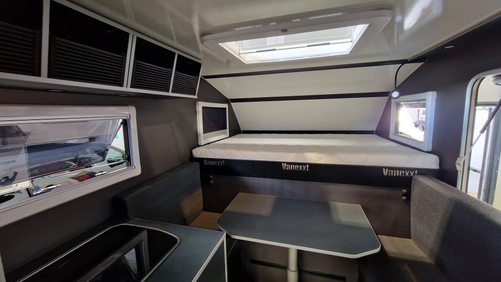 Die Vanexxt wird aus GFK-Sandwichpaneelen mit 29 mm Stärke und Fiberplast-Einlagen gefertigt. Das sorgt für besondere Stabilität und lange Haltbarkeit. Der Kabinenrahmen besteht aus geklebten Aluminium-Eckwinkelprofilen. An den stabilen Heckträger kann man Sandbleche und Kanister befestigen. Und mit einem Modul zum Fahrradträger erweitern.
