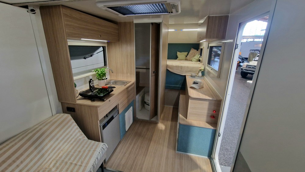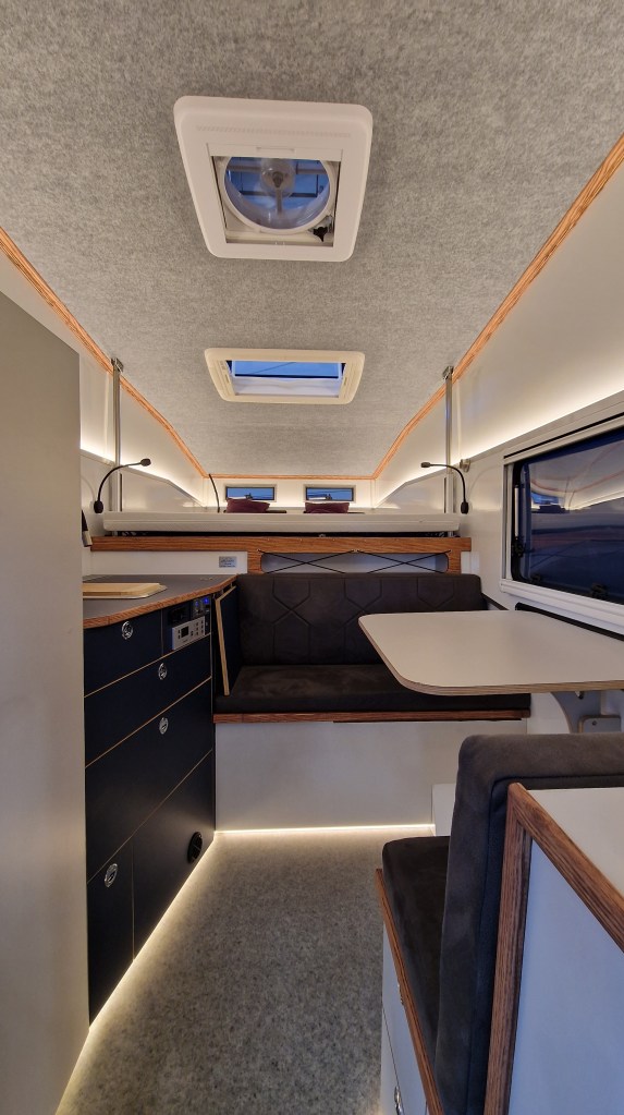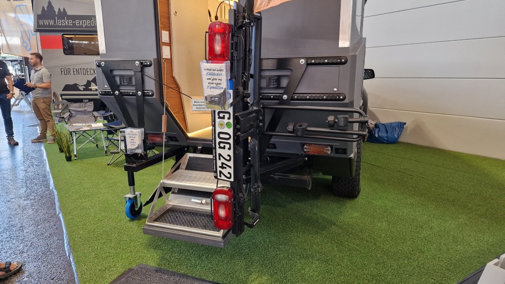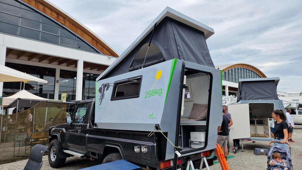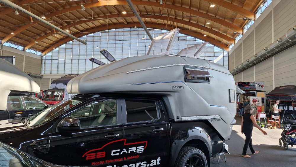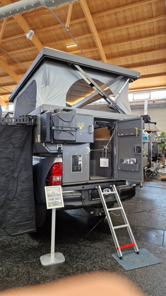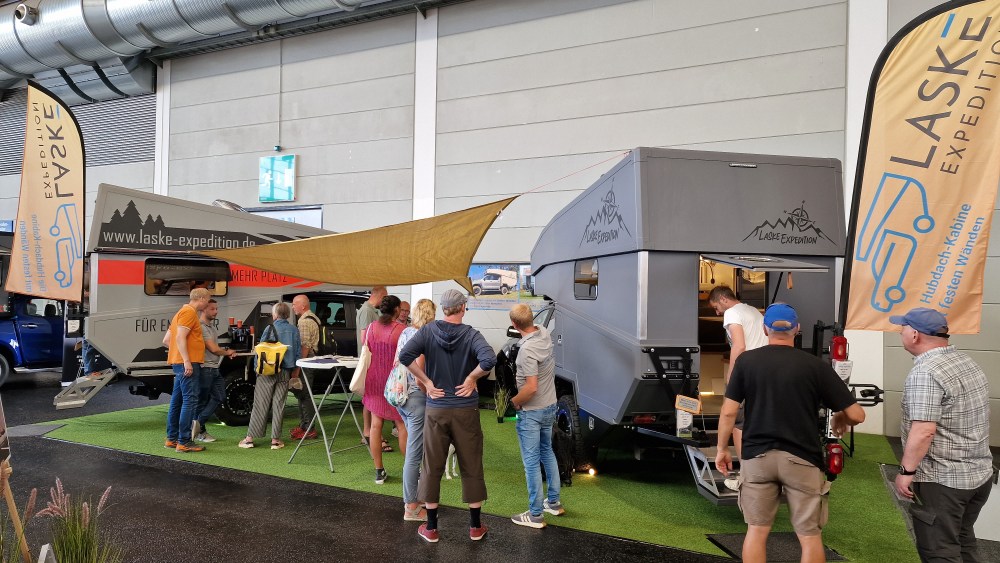 Wow! Die Firma Laske zeigt mit ihrem neuen innovativen Konzept, was man für einen wohnlichen Innenraum in einem Pickup Camper bauen kann. Es handelt sich um eine robuste Kabine mit einem festen Dach, das man hochfahren kann.Wie eine Hutschachtel stülpt sich der Deckel schräg auf den unteren Teil der Kabine. Eine tolle Idee, die sich offenbar durchsetzt und immer mehr Anhänger findet. Darüber hinaus gab es auch noch eine Lösung für einen Fahrradträger zu sehen.