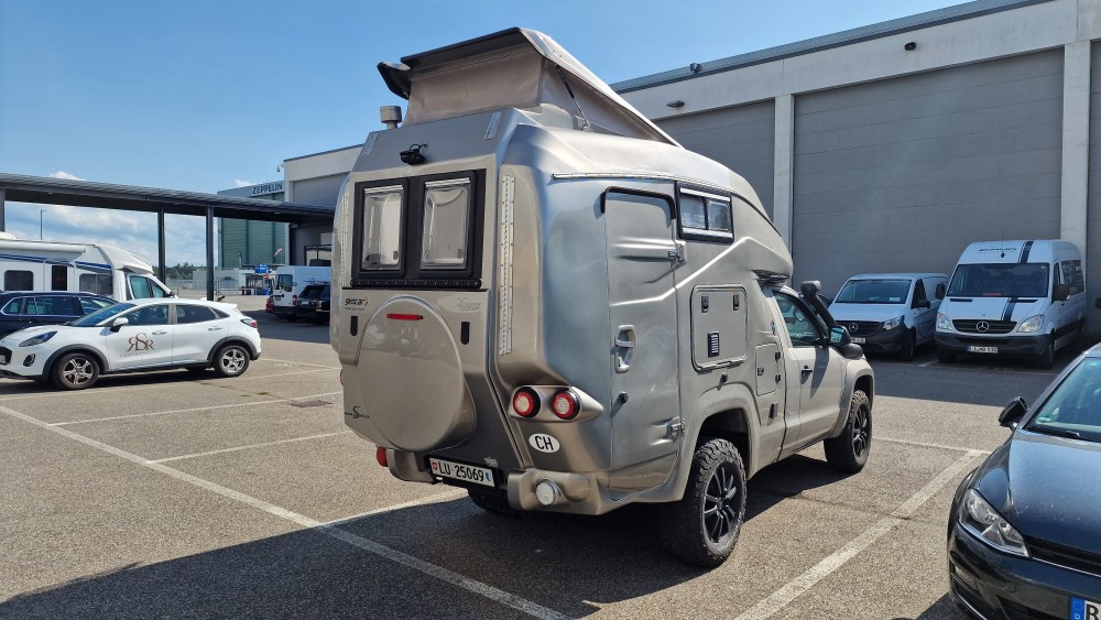Florian Gratzke habe ich einmal vor ein paar Jahren im Zillertal auf einem Campingplatz kennengelernt. Jetzt kreuzen sich unsere Wege wieder. Was für ein Zufall! Er zeigt mir seinen neuen Stork Camper. Eine moderne, leichte und aerodynamische Absetzkabine mit vielen Detaillösungen. Ich hoffe, ich kann in naher Zukunft mehr darüber berichten.