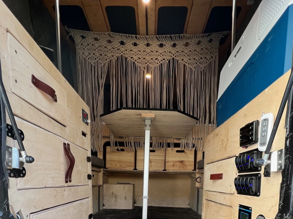Florian: Es war mir wichtig, dass ich eine kompakte Wohnkabine kreiere, bei der ich aber auch mal ganz gemütlich im Bett sitzen kann. Da sind klassische Aufstelldächer eher unpraktisch, vorallem mit meiner Körperform. Zusätzlich wollte ich den Luxus haben, dass sich das Dach komfortabel öffnen lässt ohne halb auf das Bett klettern zu müssen. Somit haben wir in vielen Interationsstufen unsere elektrische Lösung dieses Jahr entwickelt, die mit 2 Stellmotoren auskommt. Dadurch haben wir ein sehr robustes und wieder leicht zu reparierendes System entwickelt, bei dem die beiden Motoren mechanische synchronisiert werden und somit auch ein mechanisches Öffnen und Schließen möglich ist, wenn mal die Elektrik ausfällt oder ein Motor defekt ist.