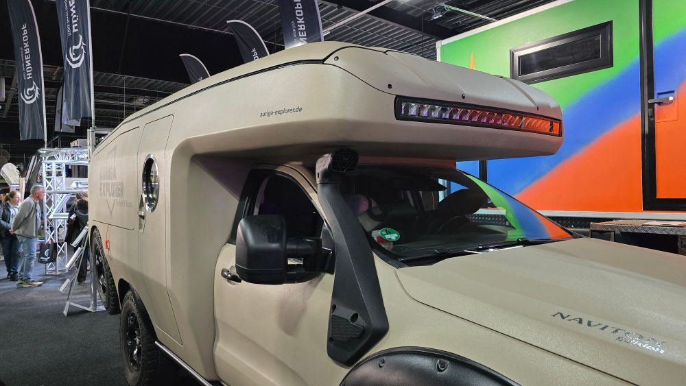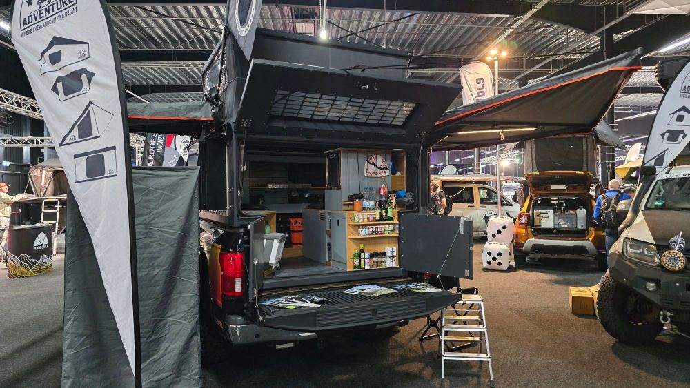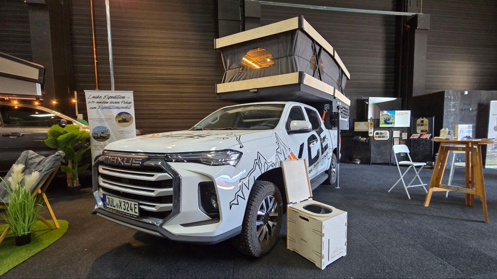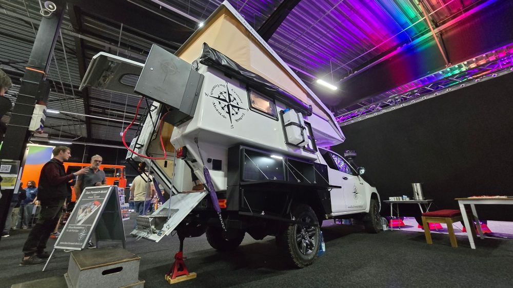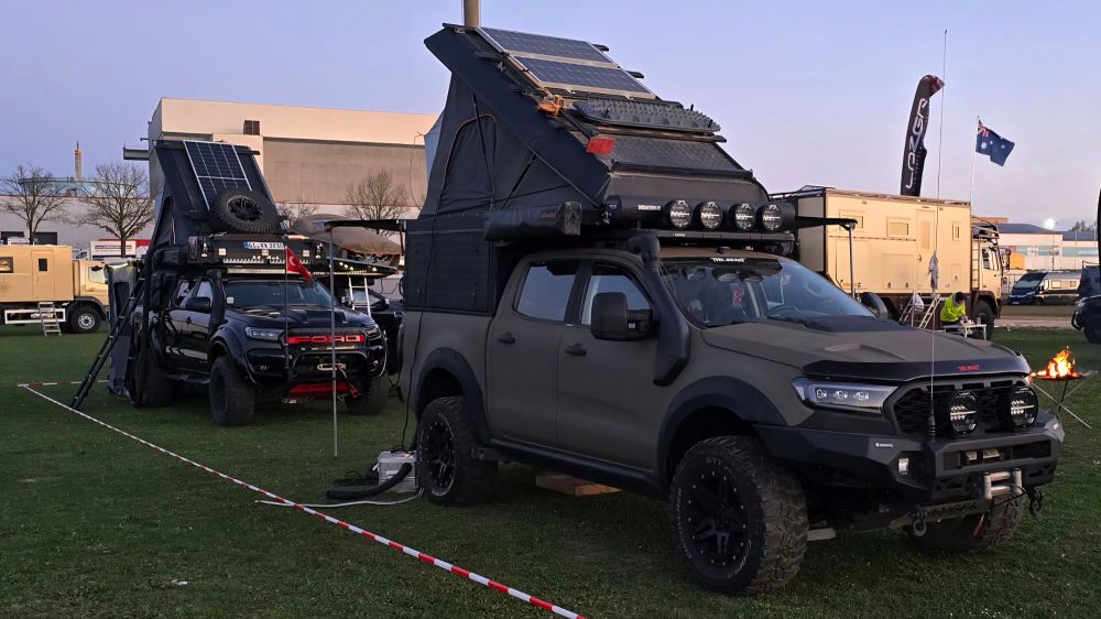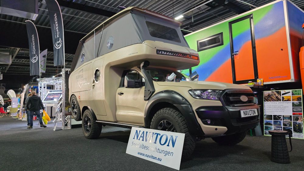 Das in Deutschland gefertigte Fahrzeug, das auf Ford Ranger und VW Amarok basiert, bietet zukünftig flexible Schlafmöglichkeiten für bis zu vier Personen und ist mit einer Küche mit Backofen, WC & Dusche sowie großzügigem Stauraum geplant. Leider gibt es auch noch keine Innenraumbilder. Das gezeigte Modell ist ein Prototyp, der kurz vor der Messe erst fertiggestellt wurde. Ein pneumatisches Aufstelldach und mehrere seitliche Slideouts erweitern den Wohnraum im Stand, während die Containerversandfähigkeit weltweite Reisen ermöglicht.