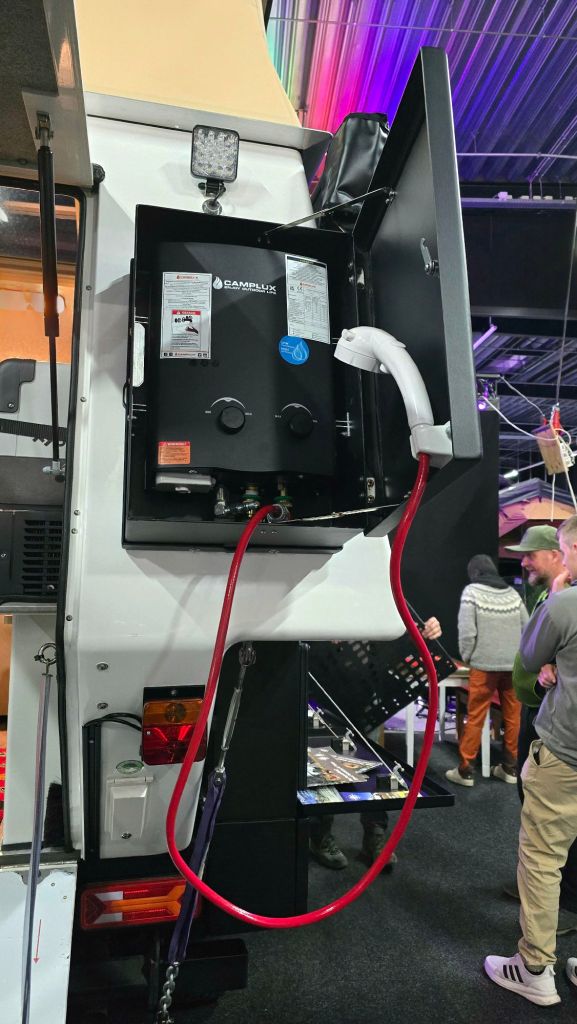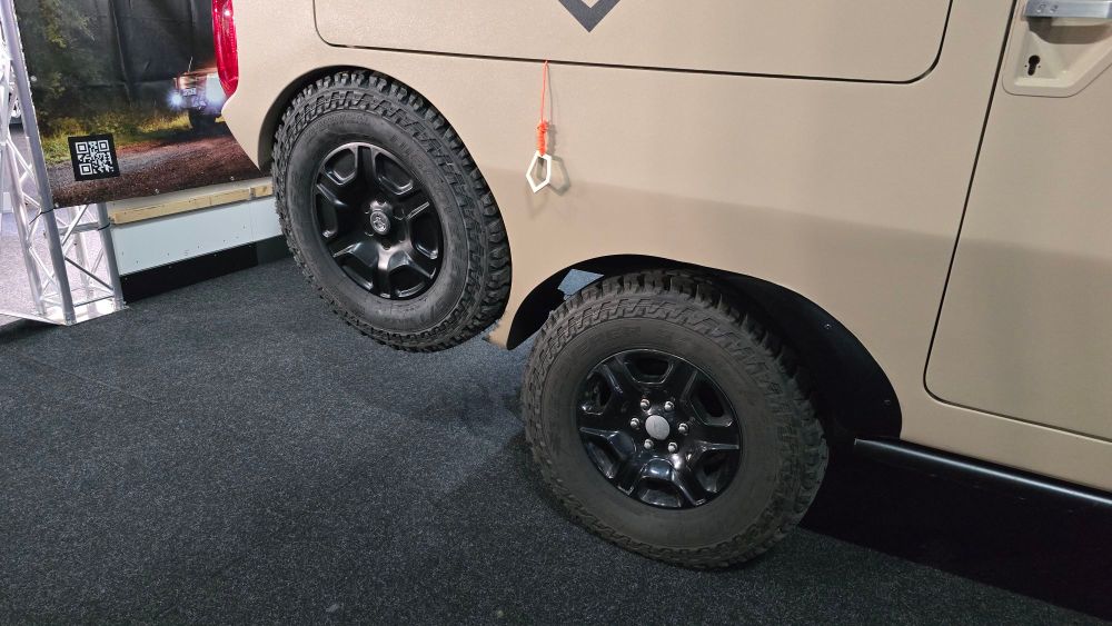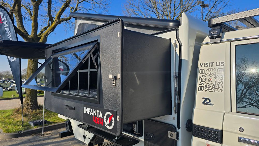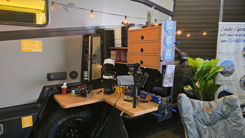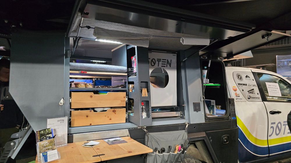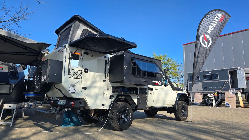 Das in Deutschland gefertigte Fahrzeug, das auf Ford Ranger und VW Amarok basiert, bietet zukünftig flexible Schlafmöglichkeiten für bis zu vier Personen und ist mit einer Küche mit Backofen, WC & Dusche sowie großzügigem Stauraum geplant. Leider gibt es auch noch keine Innenraumbilder. Das gezeigte Modell ist ein Prototyp, der kurz vor der Messe erst fertiggestellt wurde. Ein pneumatisches Aufstelldach und mehrere seitliche Slideouts erweitern den Wohnraum im Stand, während die Containerversandfähigkeit weltweite Reisen ermöglicht.