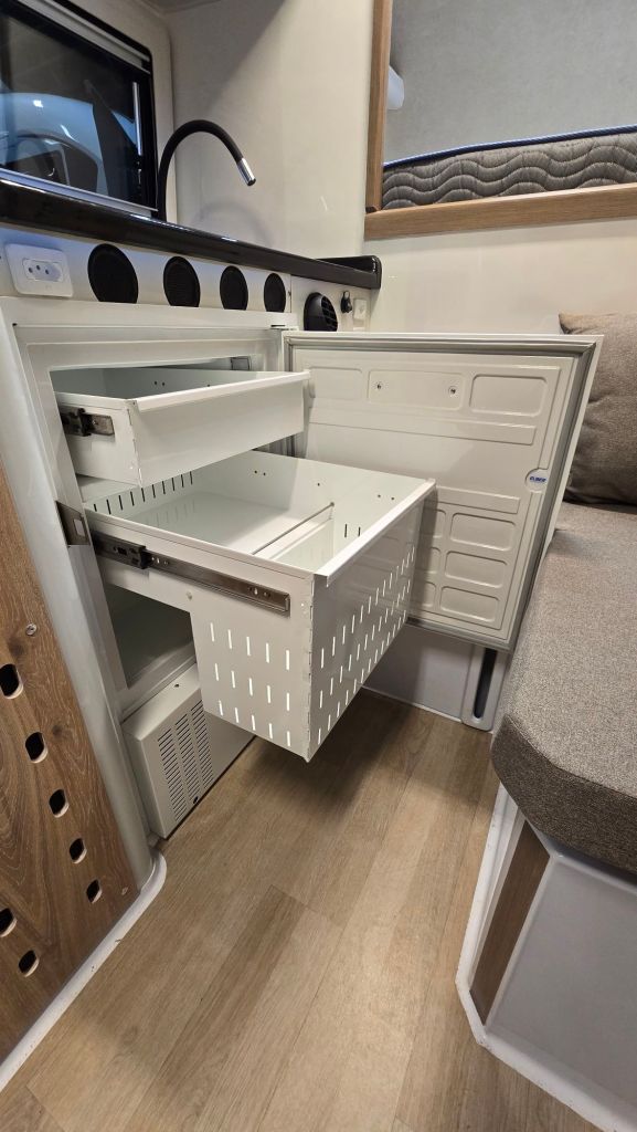 Oliver Gitschier zeigt seine Duaron, importiert aus Brasilien. Bemerkenswert ist die Raumaufteilung. Man sitzt gegenüber den Möbeln. Und der erste Kühlschrank für Pickup-Camper. Das Besondere dabei: Die Schublade passt sich genau der Form der Radkästen an! So wird kein wertvoller Stauraum verschwendet.